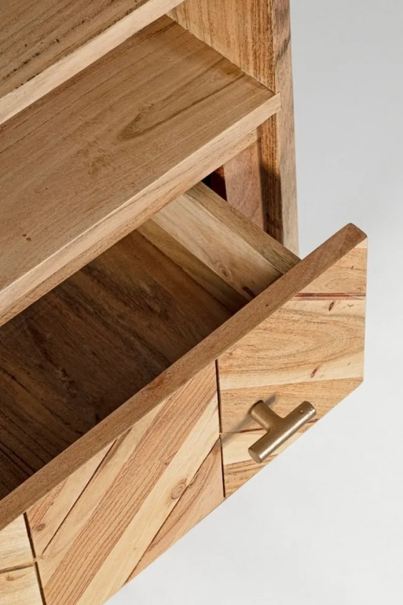 STRUTTURA IN LEGNO DI ACACIA, SCHIENALI ED INTERNO CASSETTI IN COMPENSATO, FINITURA A BASE DI VERNICE POLIURETANICA. GAMBE IN ACCIAIO VERNICIATO A POLVERE EPOSSIDICA. GAMBE DA ASSEMBLARE.