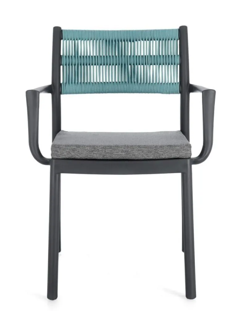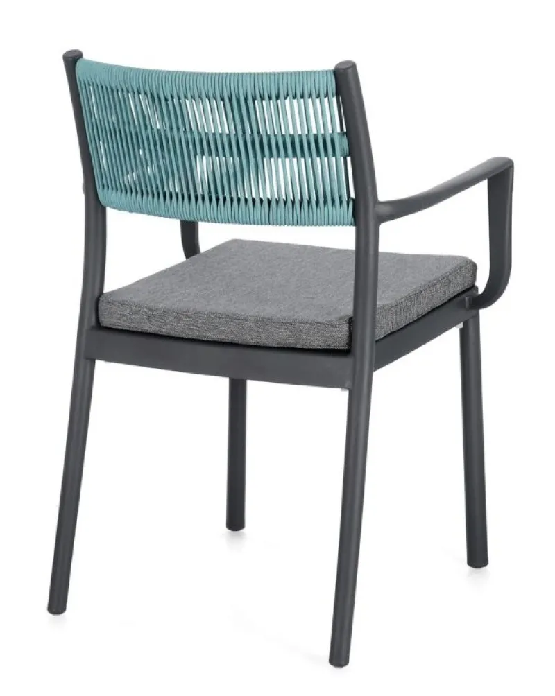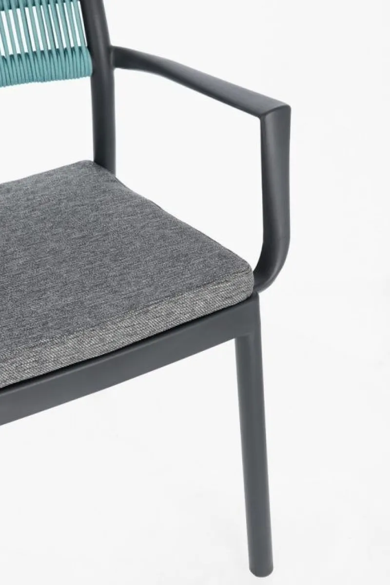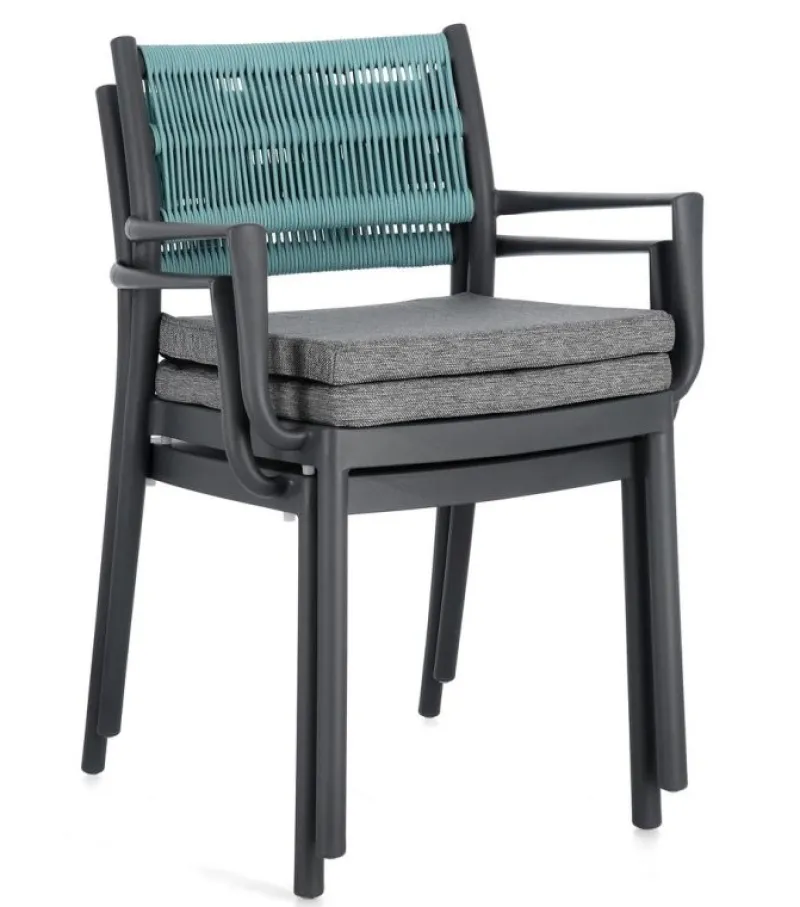POLIPROPILENE (PP), RESISTENTE AI RAGGI UV. SCHIENALE CON INTRECCIO IN CORDA DI POLIESTERE. CUSCINO SEDUTA SFODERABILE CON TESSUTO IDROREPELLENTE POLIESTERE. IMPILABILE.