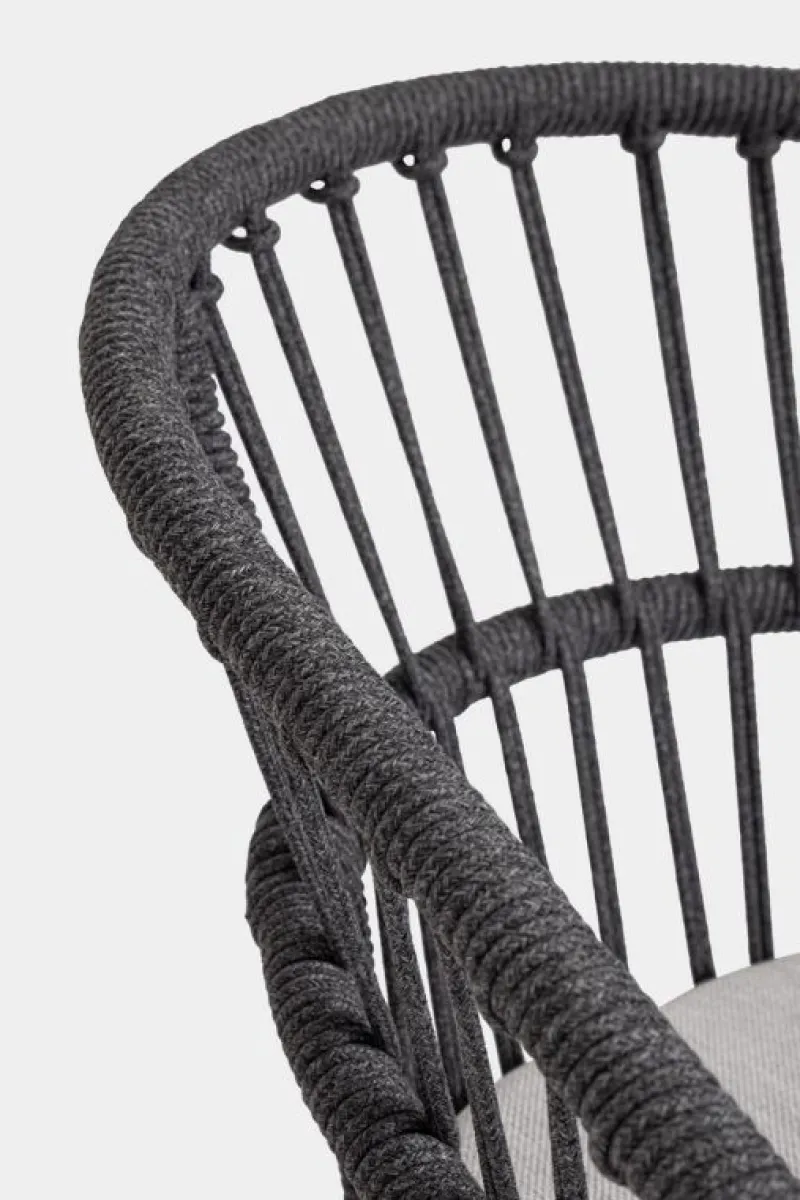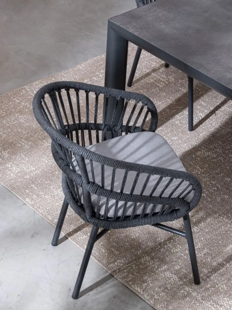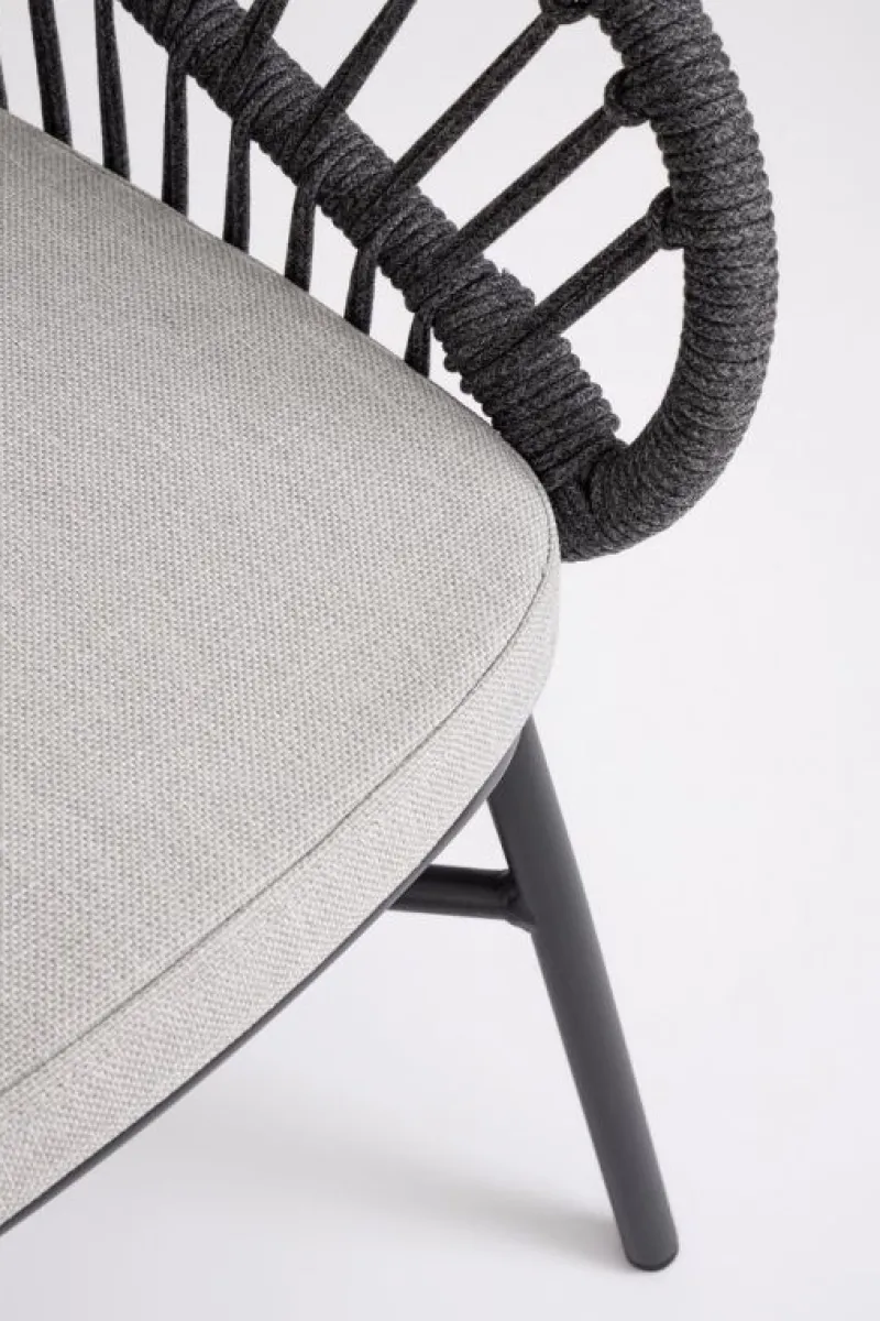STRUTTURA IN ALLUMINIO VERNICIATA A POLVERE (POLIESTERE). INTRECCIO PER ESTERNO IN CORDA (POLIESTERE). CUSCINI SFODERABILI CON TESSUTO IDROREPELLENTE OLEFIN (100% POLIPROPILENE). IMPILABILE. IMBALLO SENZA CARTONE.