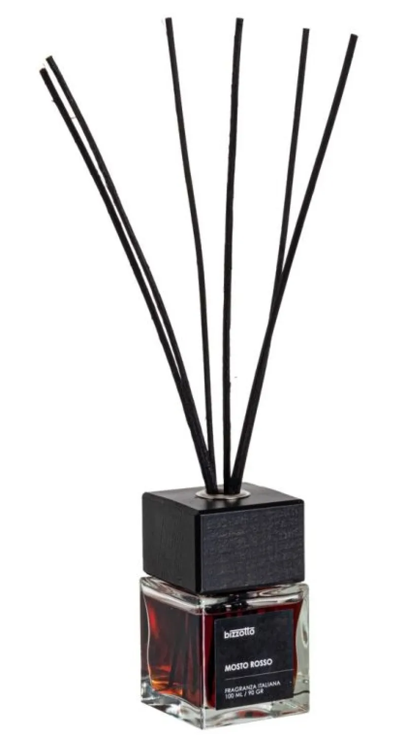 MOSTO ROSSO FRAGRANZA PER AMBIENTI CON 6 BASTONCINI NERI (H 30 CM). PROFUMO APPARTENENTE ALLA FAMIGLIA DEI FRUTTATI. BOTTIGLIA IN VETRO, FORMATO 100 ML. CONTROTAPPO IN PLASTICA E TAPPO DECORATIVO IN LEGNO NERO. AREA DI COPERTURA 20 MQ. FRAGRANZA INTENSA E FRUTTATA CON IL CARATTERE DOLCE DELL’UVA. FRAGRANZA CONSIGLIATA PER LA CUCINA ED IL SOGGIORNO. LIQUIDO E VAPORI