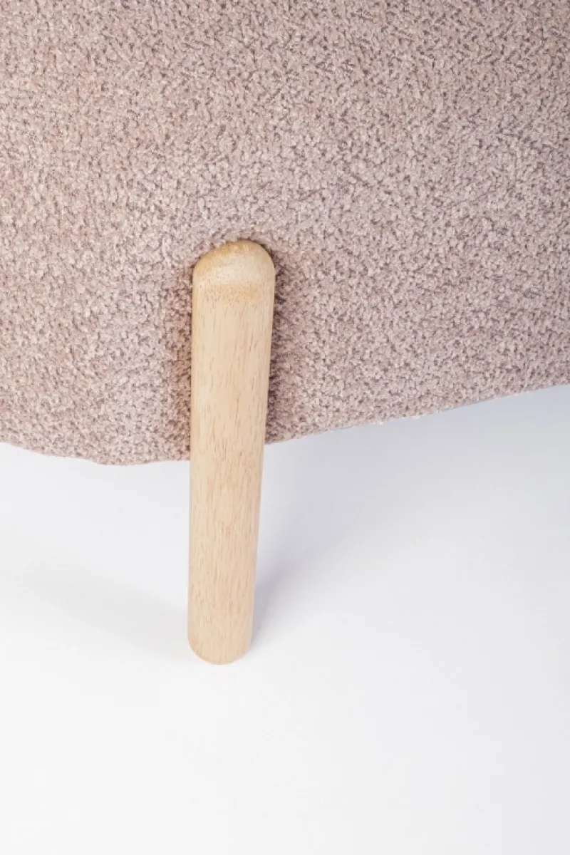 STRUTTURA IN COMPENSATO. GAMBE IN LEGNO RUBBER WOOD. RIVESTIMENTO SEDUTA IN POLIESTERE, EFFETTO BOUCLE’. IMBOTTITURA IN SCHIUMA POLIURETANICA (DENSITA’ 25KG/M3). GAMBE DA ASSEMBLARE.