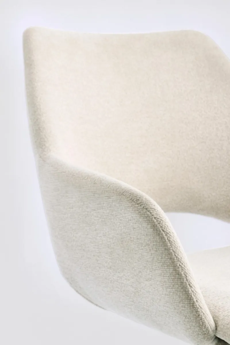 SEDUTA IN COMPENSATO CON IMBOTTITURA IN SCHIUMA POLIURETANICA. RIVESTIMENTO IN 100% POLIESTERE. GIREVOLE 360° CON MECCANISMO DI RITORNO. GAMBE IN ACCIAIO VERNICIATE A POLVERE EPOSSIDICA. GAMBE DA ASSEMBLARE.