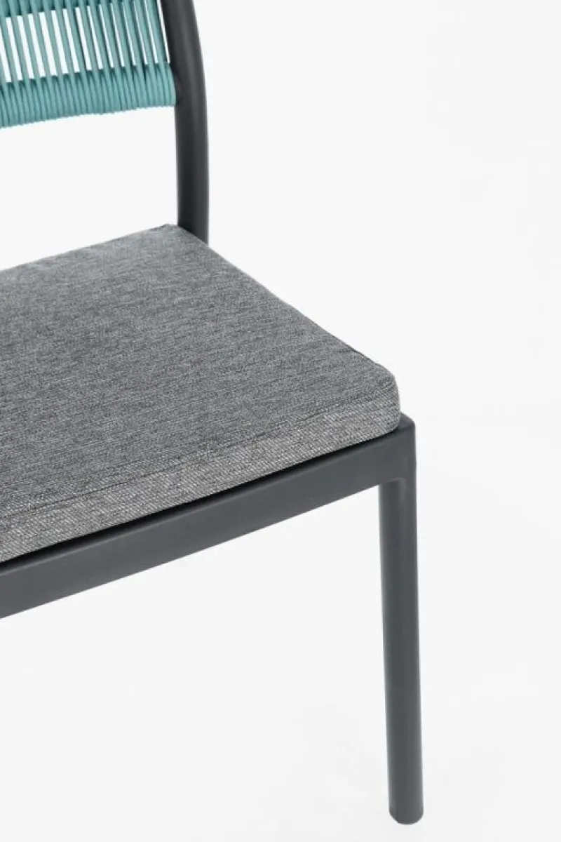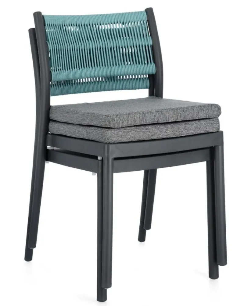 POLIPROPILENE (PP), RESISTENTE AI RAGGI UV. SCHIENALE CON INTRECCIO IN CORDA DI POLIESTERE. CUSCINO SEDUTA SFODERABILE CON TESSUTO IDROREPELLENTE POLIESTERE. IMPILABILE.