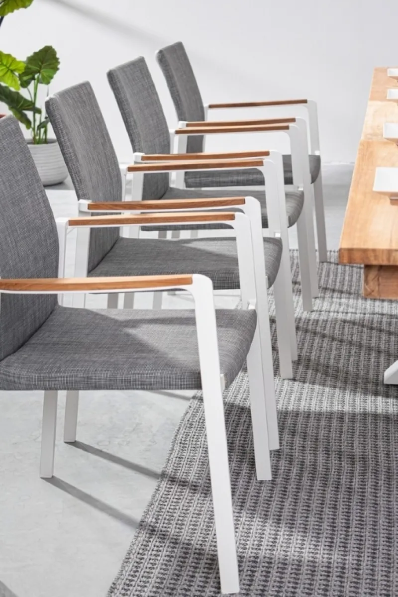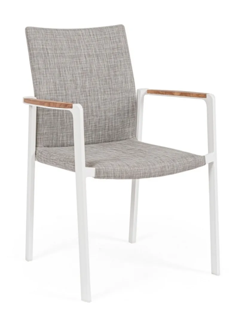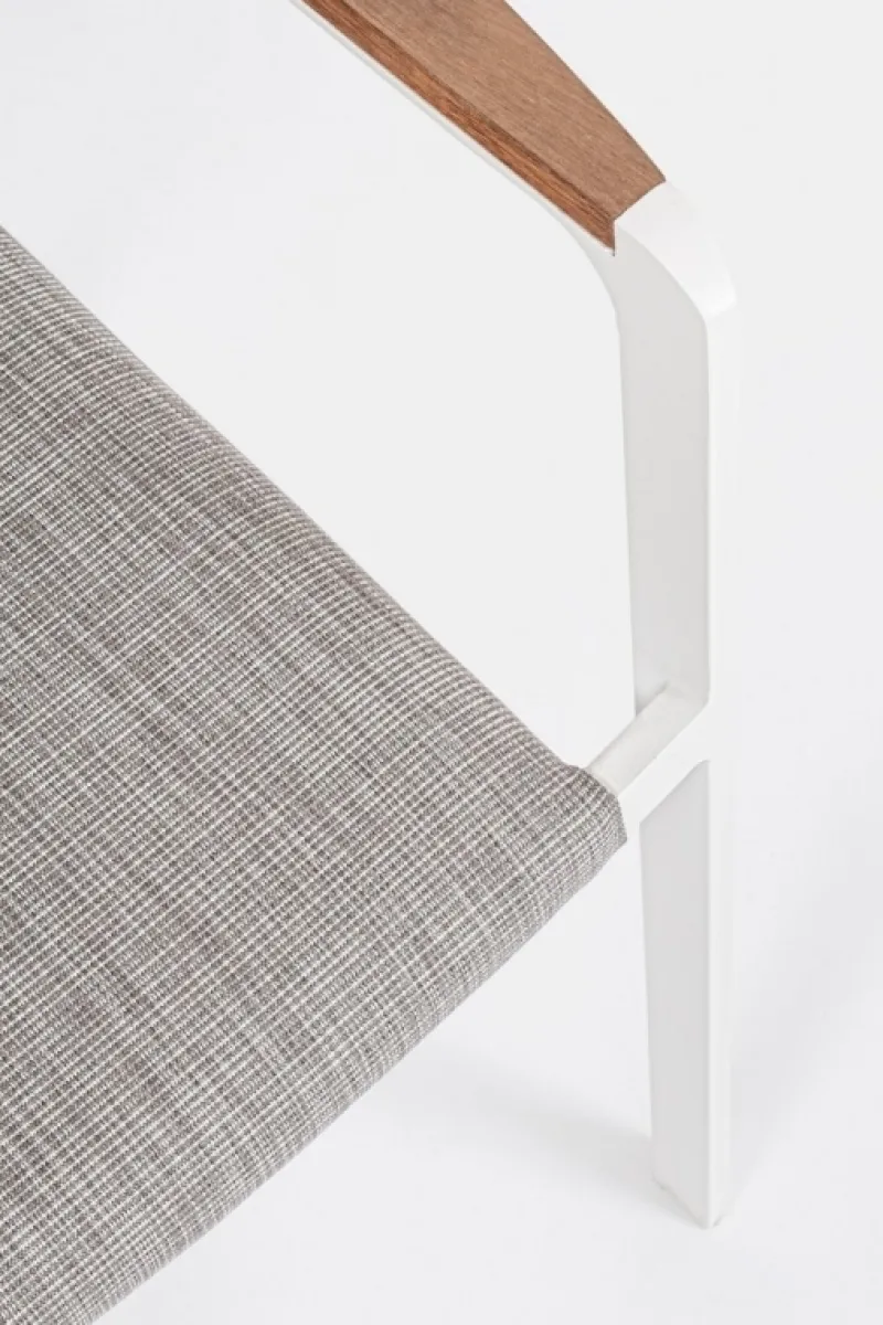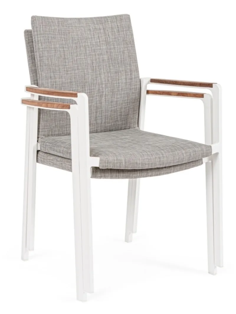 ALLUMINIO VERNICIATO A POLVERE (POLIESTERE). BRACCIOLI CON INSERTI IN TEAK. RIVESTIMENTO SEDUTA E SCHIENALE IN TESSUTO PER ESTERNO (70% TEXTILENE 30% OLEFIN), IMBOTTITURA “FAST DRY FOAM”. IMPILABILE.