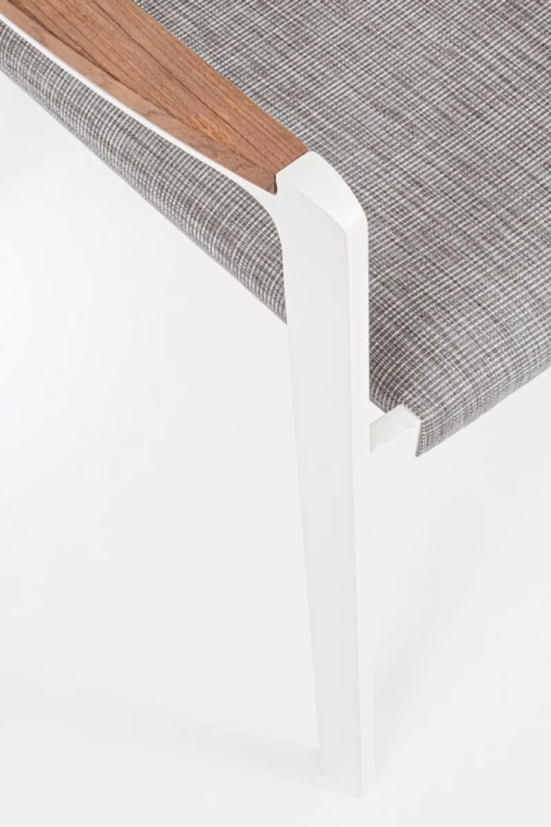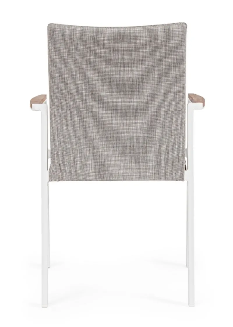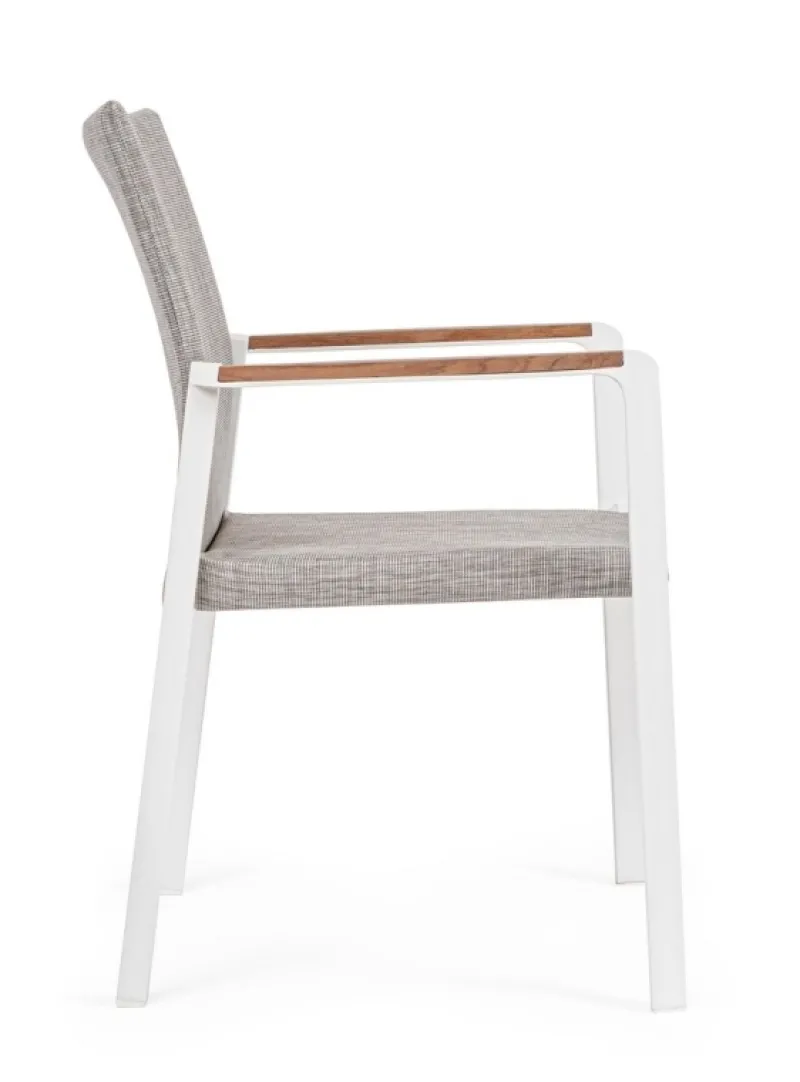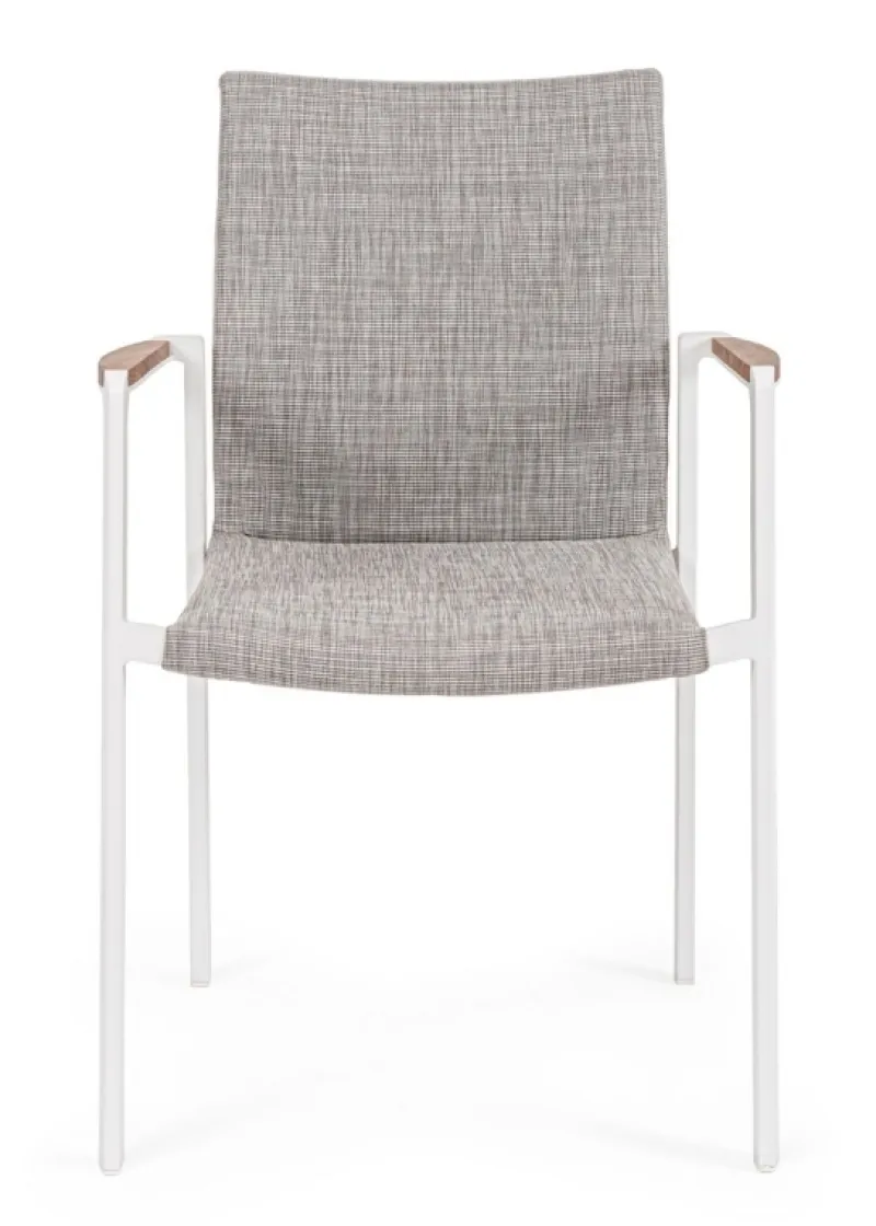 ALLUMINIO VERNICIATO A POLVERE (POLIESTERE). BRACCIOLI CON INSERTI IN TEAK. RIVESTIMENTO SEDUTA E SCHIENALE IN TESSUTO PER ESTERNO (70% TEXTILENE 30% OLEFIN), IMBOTTITURA “FAST DRY FOAM”. IMPILABILE.
