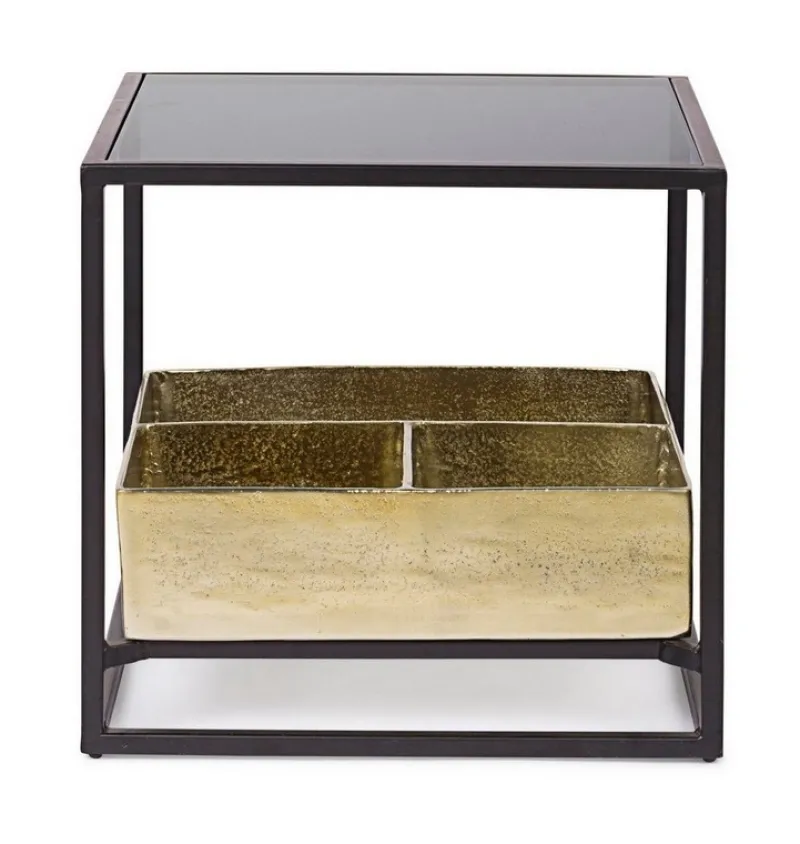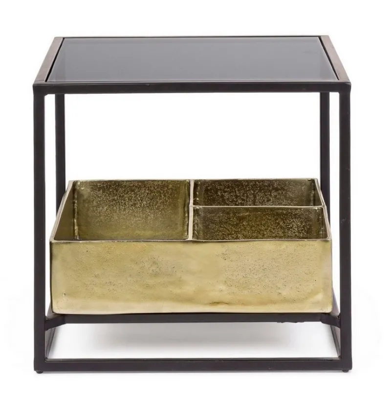 STRUTTURA IN ACCIAIO VERNICIATA A POLVERE EPOSSIDICA. PIANO SUPERIORE IN VETRO TEMPERATO. PIANO INFERIORE CON CONTENITORE IN ALLUMINIO CON FINITURA PLACCATA OTTONE ED ANTICATA.