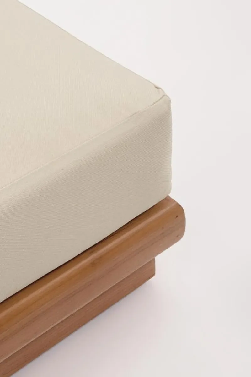 STRUTTURA IN IN TEAK – SVLK (LEGNO CERTIFICATO PROVENIENTE DA FORESTE SOSTENIBILI), FINITURA FINALE A BASE D’ACQUA. CUSCINI SFODERABILI IN TESSUTO IDROREPELLENTE SUNPROOF OLEFIN (100%POLYPROPYLENE). IL TEAK È UN LEGNO RICCO DI OLII. CON IL PASSARE DEL TEMPO, QUESTI OLII, PER UN PROCESSO NATURALE, RISALGONO IN SUPERFICIE E POSSONO MACCHIARE EVENTUALI CUSCINI A DIRETTO CONTATTO CON IL LEGNO.