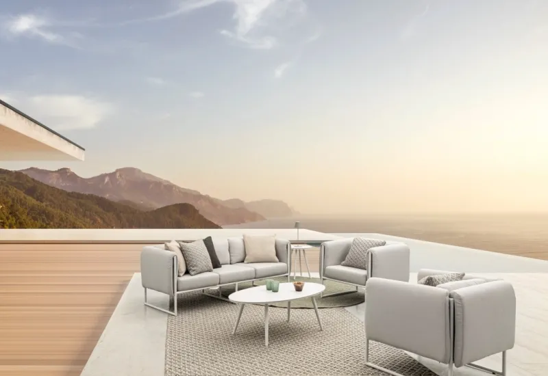 STRUTTURA IN ALLUMINIO VERNICIATO A POLVERE (POLIESTERE). SEDUTA COMPLETA CON IMBOTTITURA IMPERMEABILE, RIVESTIMENTO NON SFODERABILE IN TESSUTO PER ESTERNO IN OLEFIN (100% POLIPROPILENE, 285G/M2),IDROREPELLENTE E RESISTENTE AI RAGGI UV (GRADO 7). CUSCINETTO SCHIENALE SFODERABILE IN TESSUTO OLEFIN.