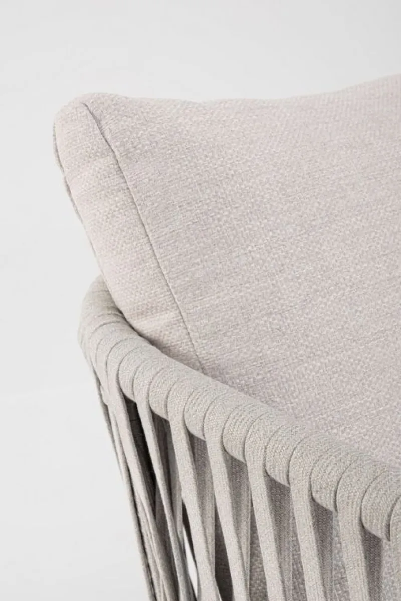 STRUTTURA IN ALLUMINIO VERNICIATO A POLVERE (POLIESTERE). INTRECCIO CON CORDE IN TETORON (100% POLIESTERE). CUSCINI SEDUTA E SCHIENALE SFODERABILI IN TESSUTO IDROREPELLENTE OLEFIN (100% POLIPROPILENE).