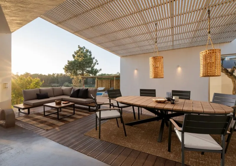 STRUTTURA IN ALLUMINIO VERNICIATO A POLVERE (POLIESTERE). BRACCIOLI IN ALLUMINIO CON VERNICIATURA EFFETTO LEGNO. CUSCINO SEDUTA SFODERABILE CON TESSUTO IDROREPELLENTE OLEFIN (100% POLIPROPILENE). IMPILABILE.