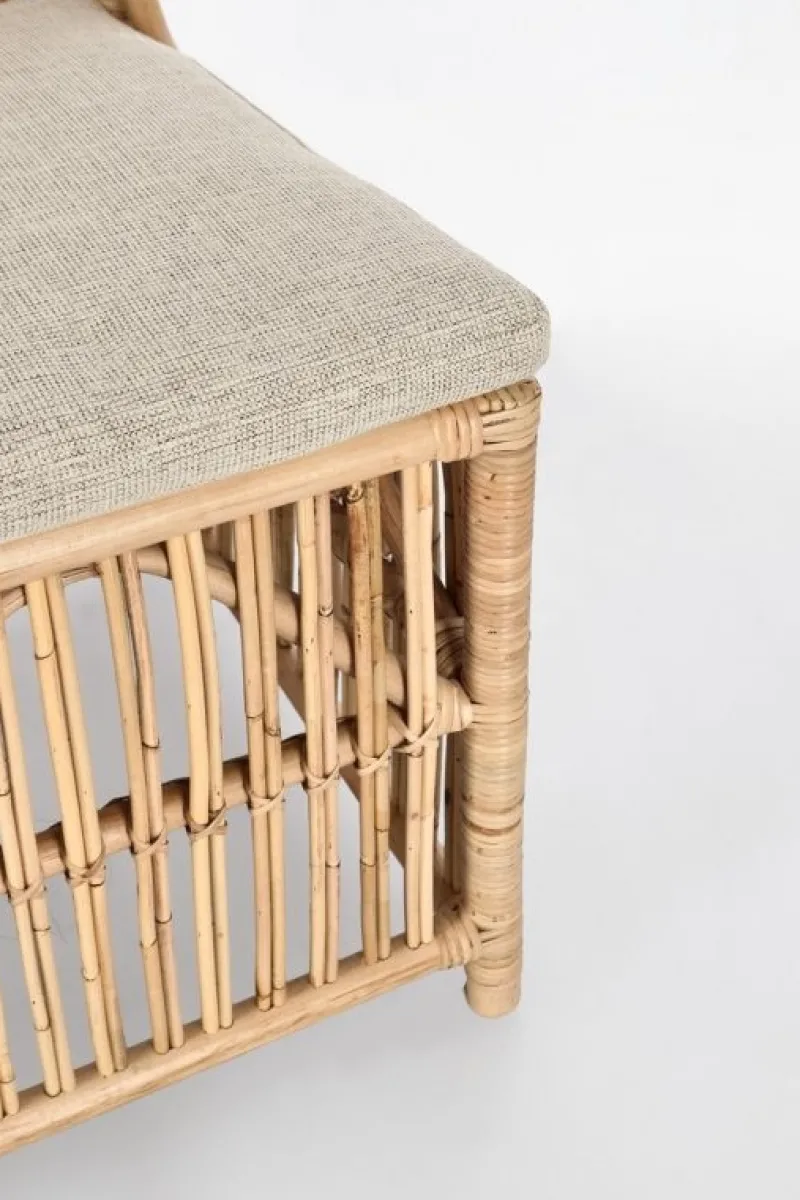 STRUTTURA IN RATTAN JAWIT, FINITURA NATURALE A BASE DI NITROCELLULOSA. CUSCINI SFODERABILI CON TESSUTO 100% POLIESTERE. SI RACCOMANDA DI NON ESPORRE IL MOBILE ALLA LUCE DIRETTA DEL SOLE E ALLE INTEMPERIE. IMBALLO SENZA CARTONE.