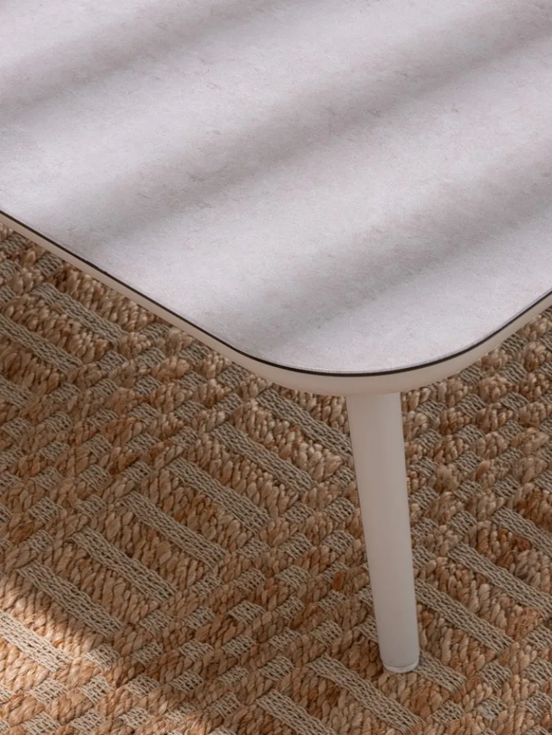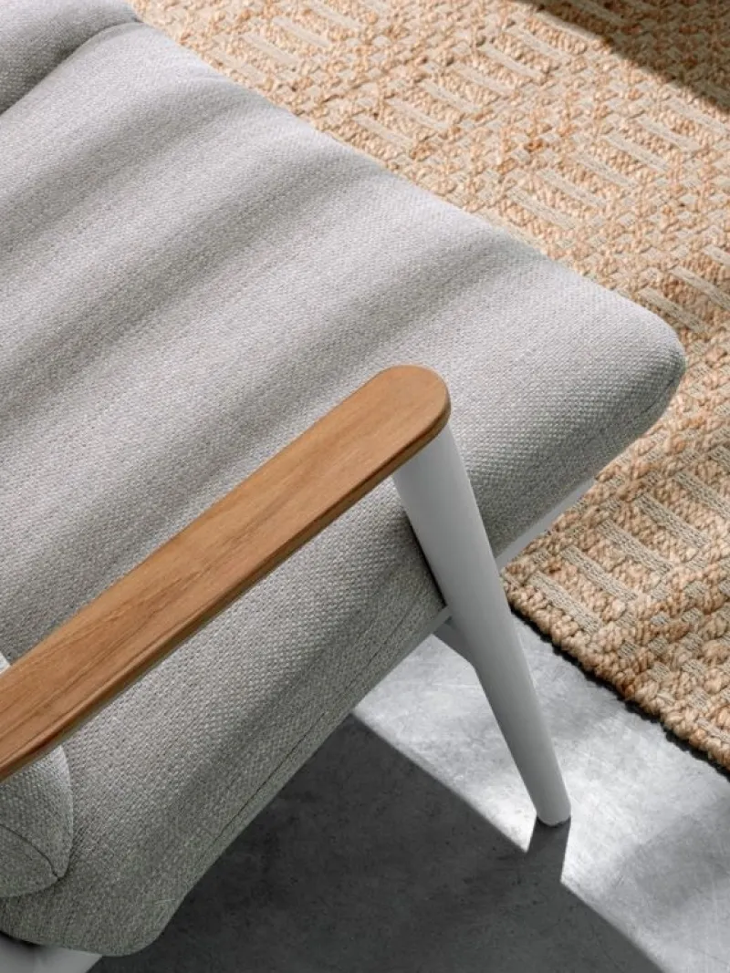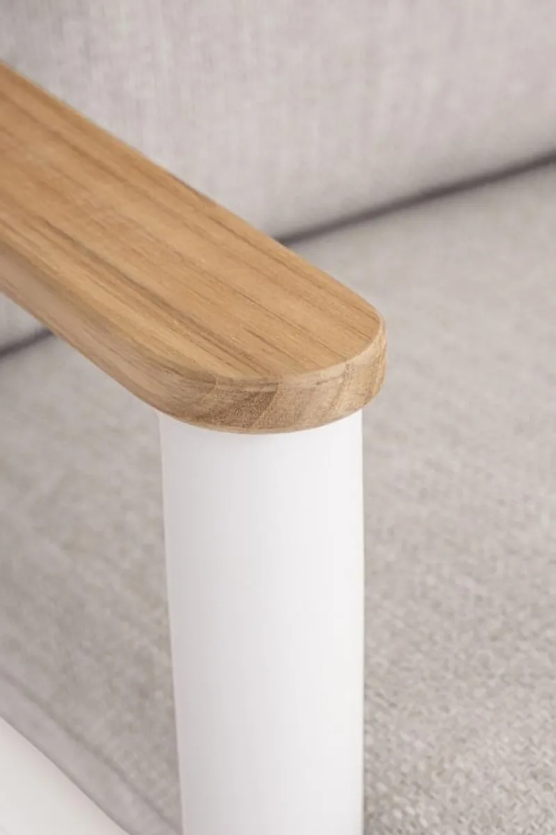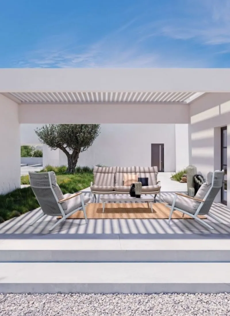 STRUTTURA IN ALLUMINIO VERNICIATO A POLVERE (POLIESTERE). SCHIENALI CON INTRECCIO IN CORDE DI POLIESTERE. BRACCIOLI CON INSERTI IN TEAK. CUSCINI SEDUTA E SCHIENALE SFODERABILI CON TESSUTO IDROREPELLENTE OLEFIN (100% POLIPROPILENE). TAVOLINO CON PIANO IN VETRO CON EFFETTO MATERICO. GAMBE TAVOLINO (VITERIA IN ACCIAIO INOSSIDABILE) DA ASSEMBLARE.