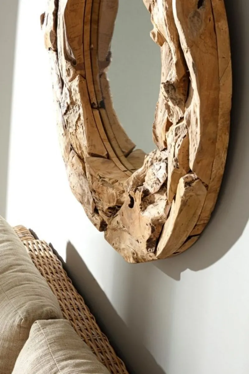 RADICI DI TEAK CON FINITURA RUSTICA NATURALE E VETRO. LE FORME ORIGINALI CREATE DAL LEGNO SONO SOLO INDICATIVE, TUTTI I PRODOTTI SARANNO DIVERSI L’UNO DALL’ALTRO. MISURA SPECCHIO:Ø63