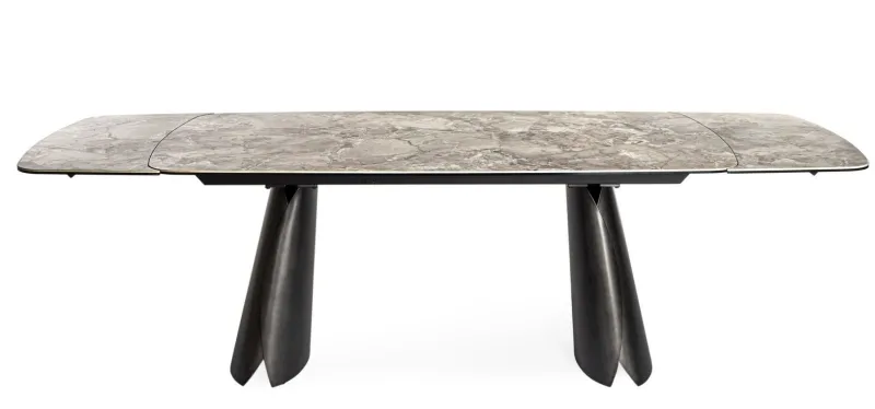 PIANO IN CERAMICA EFFETTO GRIGIO CARNICO LUCIDO E STRATO INFERIORE PIANO IN VETRO TEMPERATO. SUPPORTO PIANO IN ACCIAIO VERNICIATO A POLVERE EPOSSIDICA. GAMBE IN ACCIAIO EFFETTO ARGENTO SCURO SPAZZOLATO. PROLUNGHE INDIPENDENTI. GAMBE DA ASSEMBLARE.