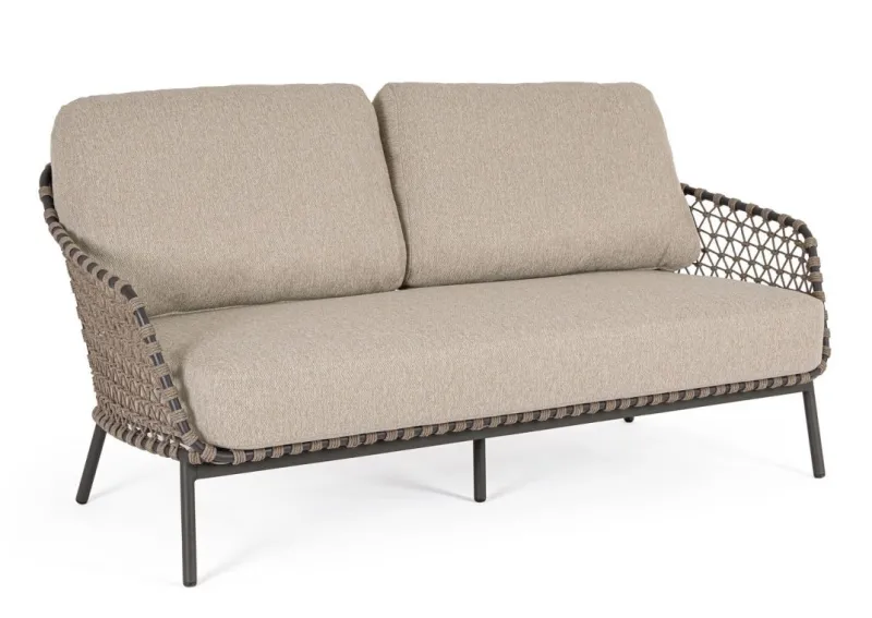 STRUTTURA IN ACCIAIO INOSSIDABILE (201). INTRECCIO PER ESTERNO IN CORDA (POLIPROPILENE). CUSCINI SFODERABILI IN TESSUTO IDROREPELLENTE SUNPROOF OLEFIN (100%POLYPROPYLENE).