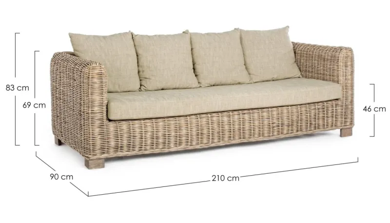 STRUTTURA IN LEGNO DI MANGO E RATTAN, INTRECCIO IN KUBU, FINITURA NATURALE A BASE DI NITROCELLULOSA. CUSCINI SFODERABILI CON TESSUTO PER USO INTERNO (55% COTONE, 45% POLIESTERE). SI RACCOMANDA DI NON ESPORRE IL MOBILE ALLA LUCE DIRETTA DEL SOLE E ALLE INTEMPERIE. IMBALLO SENZA CARTONE.