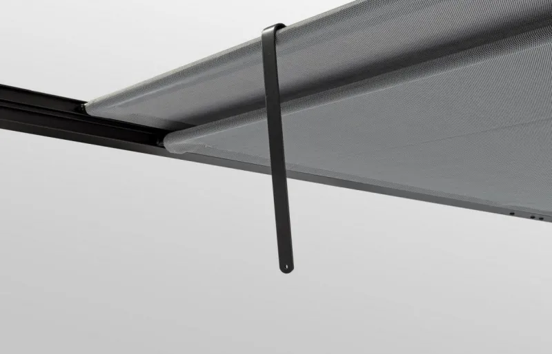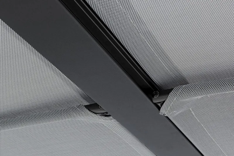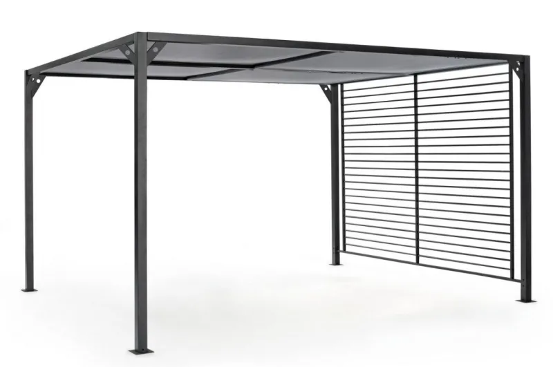 STRUTTURA IN ALLUMINIO VERNICIATO A POLVERE (POLIESTERE). PALI 65X65MM, TETTUCCIO SUPERIORE SCORREVOLE IN TEXTILENE GRIGIO SCURO. DA ASSEMBLARE.