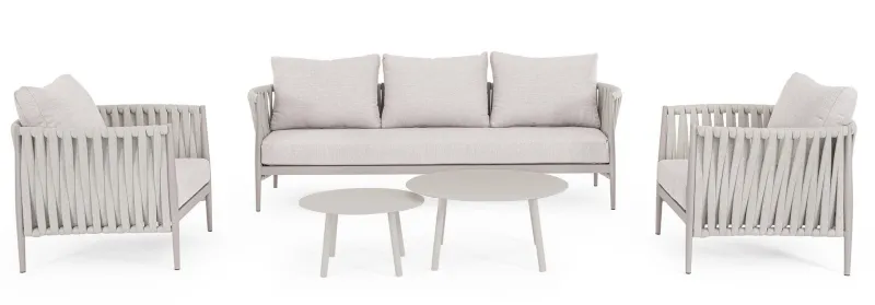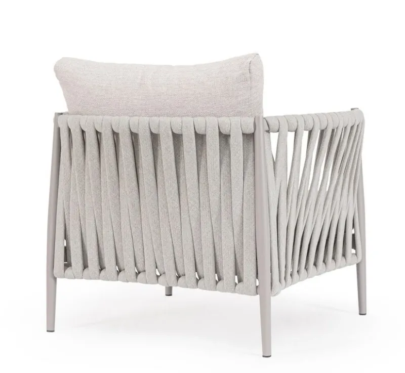 STRUTTURA IN ALLUMINIO VERNICIATO A POLVERE (POLIESTERE). INTRECCIO CON CORDE IN TETORON (100% POLIESTERE) CON IMBOTTITURA IN GOMMA (POLIETILENE). CUSCINO SEDUTA E SCHIENALE SFODERABILE IN TESSUTO IDROREPELLENTE OLEFIN (100% POLIPROPILENE).