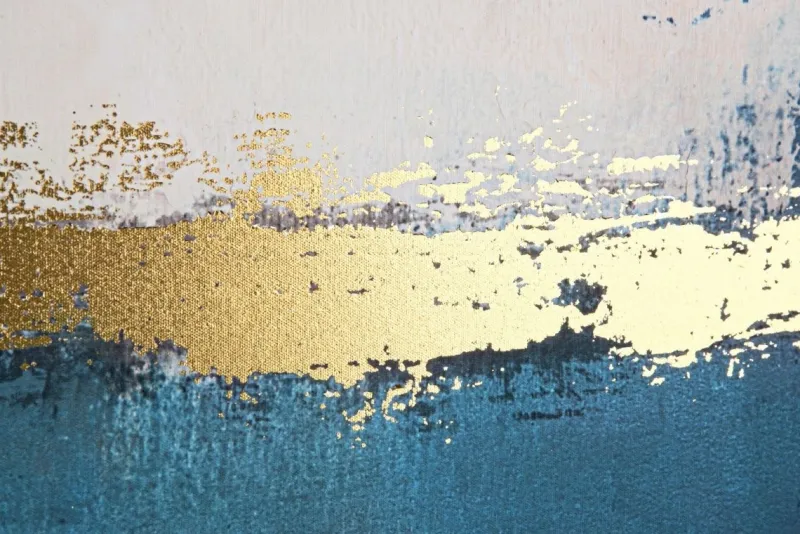 STAMPA SU TELA CON APPLICAZIONI FOGLI DORATI, STRUTTURA IN LEGNO DI PINO. CORNICE IN PLASTICA.