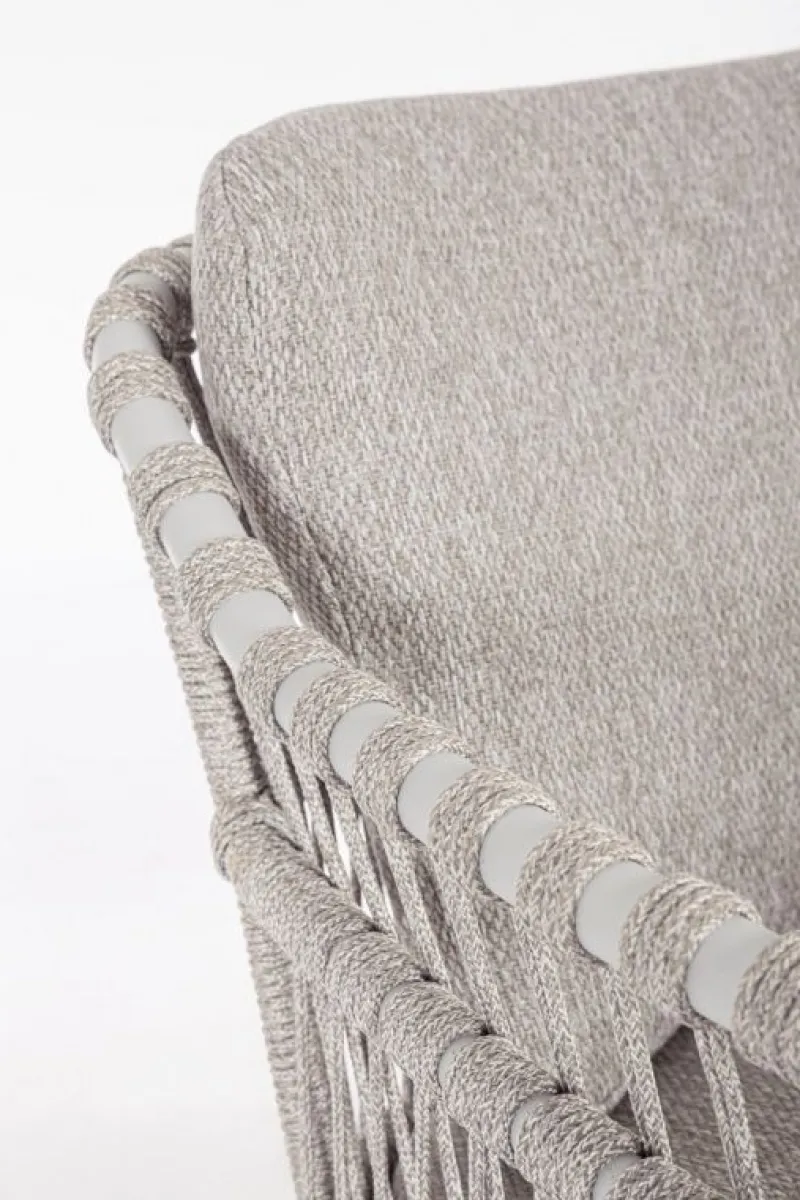 STRUTTURA IN ACCIAIO INOSSIDABILE (201). INTRECCIO PER ESTERNO IN CORDA (POLIPROPILENE). CUSCINI SFODERABILI IN TESSUTO IDROREPELLENTE SUNPROOF OLEFIN (100%POLYPROPYLENE).