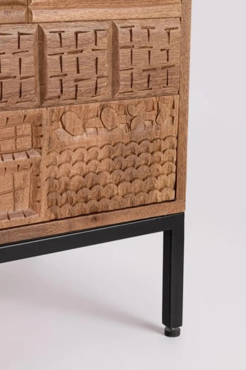 STRUTTURA IN LEGNO MANGO MASSICCIO, SCHIENALE IN MDF. VERNICIATURA A BASE DI NITROCELLULOSA. GAMBE E MANIGLIE IN ACCIAIO. FRONTALE CASSETTI ED ANTE INTARSIATI E LAVORATI A MANO. VANO PORTA COMPRENSIVO DI MENSOLA. GAMBE DA ASSEMBLARE.