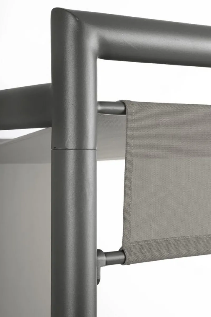 STRUTTURA IN ALLUMINIO, VERNICIATO A POLVERE (POLIESTERE). SEDUTA LETTINI IN TEXTILENE, RECLINABILE IN ENTRAMBE LE DIREZIONI IN 4 POSIZIONI. TETTUCCIO PARASOLE IN TEXTILENE SCORREVOLE IN 3 POSIZIONI. CUSCINI SFODERABILI CON TESSUTO IDROREPELLENTE OLEFIN (100% POLIPROPILENE). VITERIA IN ACCIAIO INOSSIDABILE. DA ASSEMBLARE.