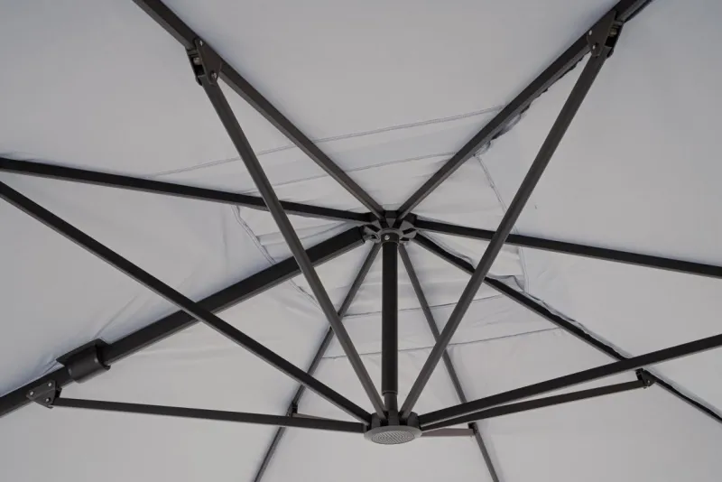 STRUTTURA IN ALLUMINIO VERNICIATA A POLVERE (POLIESTERE). PALO 55X82MM. 8 STECCHE 14.5X24MM. TELO GRIGIO CHIARO IN POLIESTERE 250GR/M2 CON RIVESTIMENTO IN PA (POLIAMMIDE) CON CAMINO ANTIVENTO. BASE A CROCE IN ACCIAIO. PALO GIREVOLE 360° CON PEDALINA. INCLINAZIONE VERTICALE CON IMPUGNATURA A 5 POSIZIONI. COMPRENSIVO DI COPRIOMBRELLONE. MARMETTE NON INCLUSE.