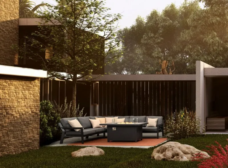 ALLUMINIO VERNICIATO A POLVERE (POLIESTERE). CUSCINI SFODERABILI CON TESSUTO IDROREPELLENTE 100% POLIESTERE. TAVOLO IN ALLUMINIO VERNICIATO A POLVERE (POLIESTERE) CON PIANO IN VETRO (SPESSORE 8MM) SERIGRAFATO EFFETTO CERAMICA E CAMINO CENTRALE A GAS. PARAVENTO PER CAMINO IN VETRO TEMPERATO E COPERCHIO IN ALLUMINIO. BRUCIATORE IN ACCIAIO INOSSIDABILE (#304). MANOPOLA DI