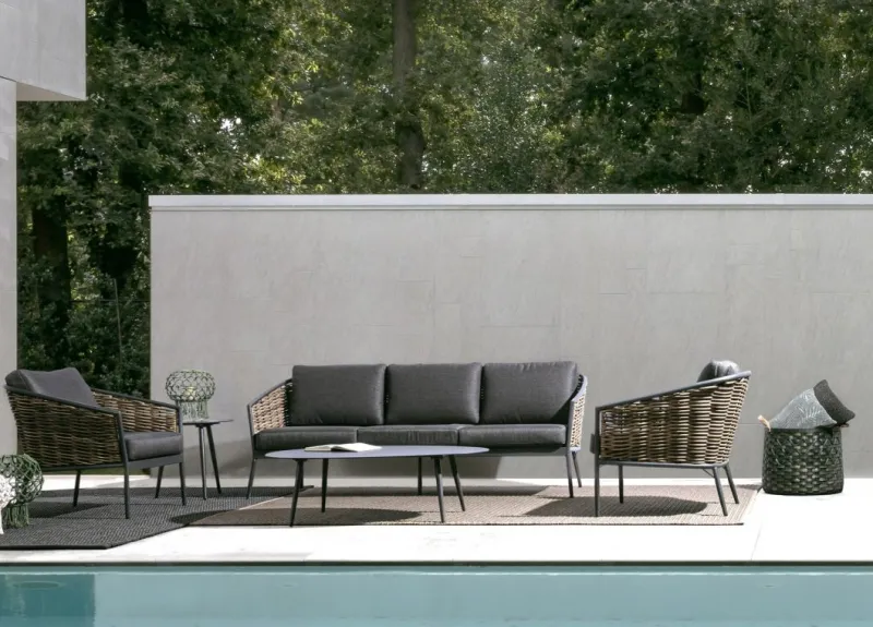 STRUTTURA IN ALLUMINIO VERNICIATA A POLVERE (POLIESTERE). INTRECCIO IN FIBRA SINTETICA (TONDA 9MM). CUSCINI SEDUTA E SCHIENALE SFODERABILI CON TESSUTO IDROREPELLENTE OLEFIN (100% POLIPROPILENE).