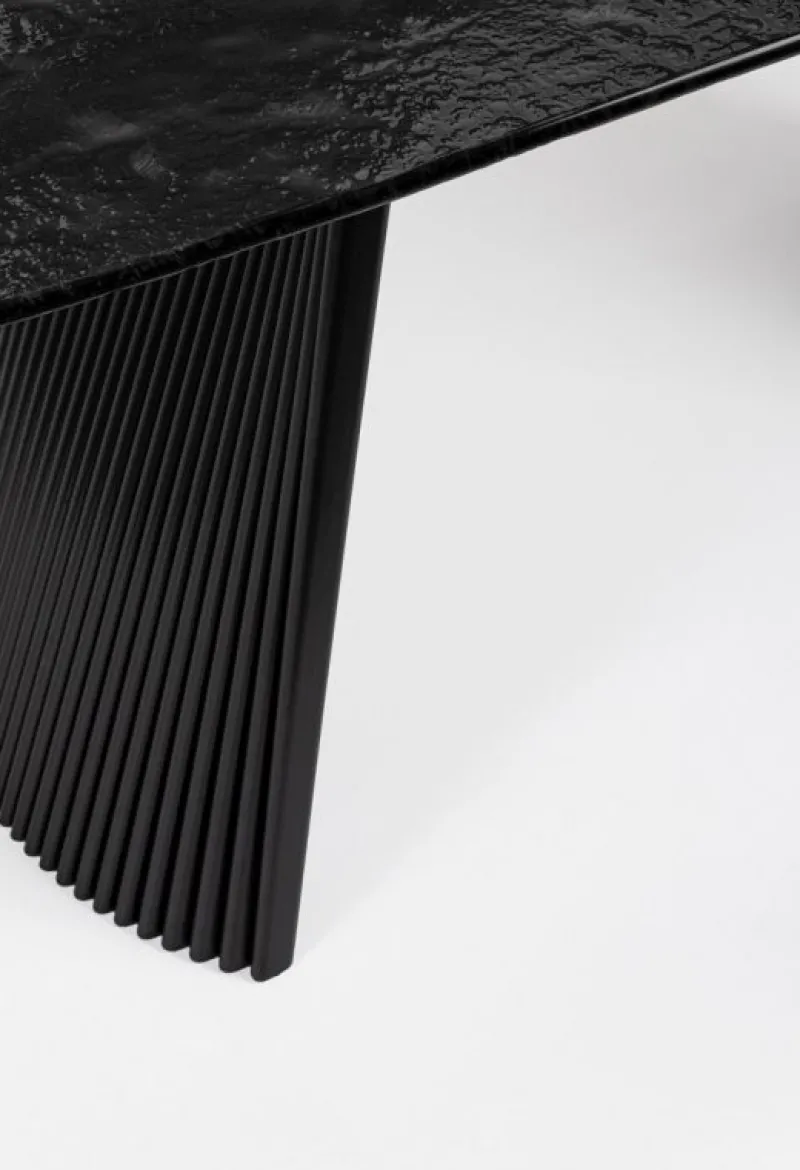 GAMBE IN ACCIAIO VERNICIATO A POLVERE EPOSSIDICA. PIANO IN VETRO (10MM) ALLUNGABILE CON EFFETTO BOCCIARDATO. GAMBE DA ASSEMBLARE.