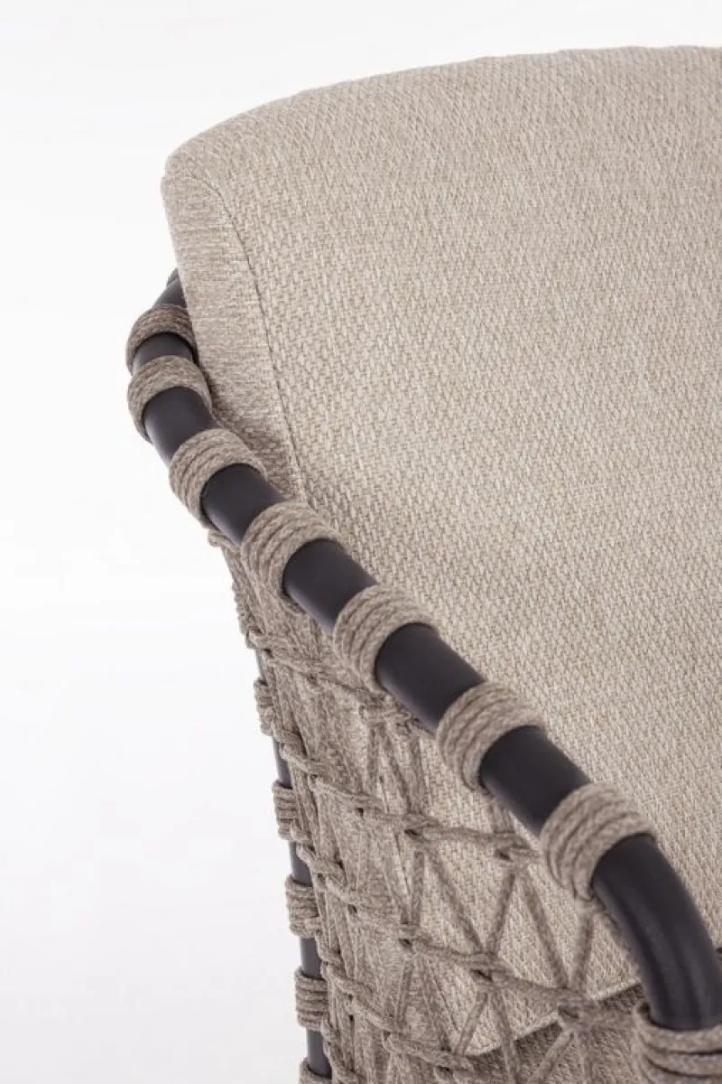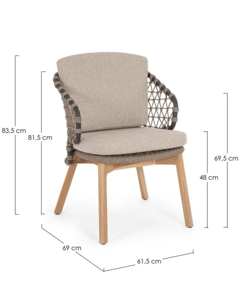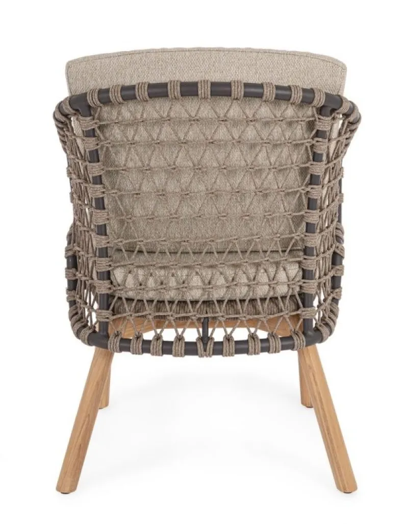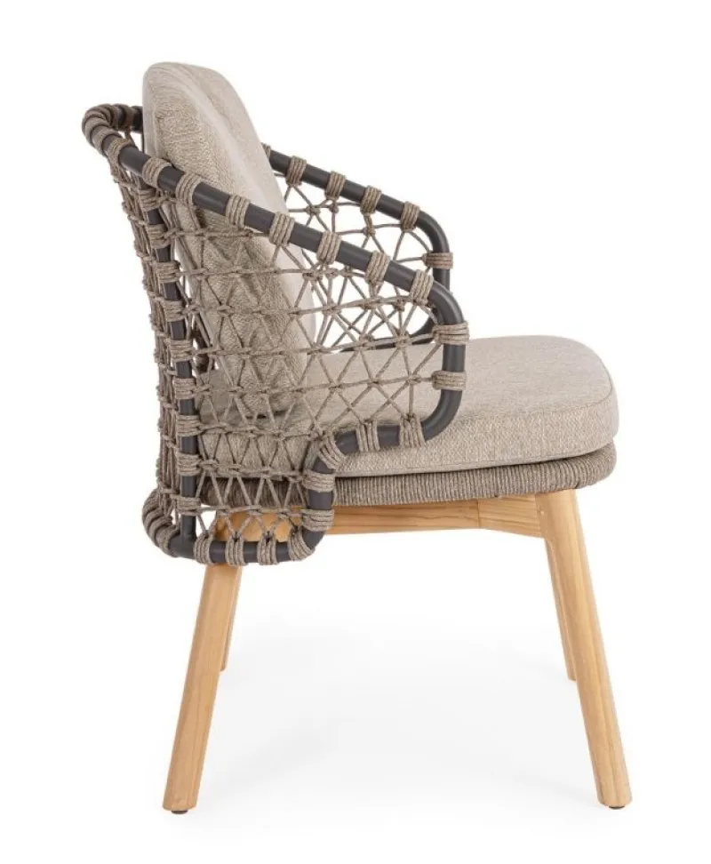 STRUTTURA IN ALLUMINIO VERNICIATA A POLVERE (POLIESTERE). GAMBE IN TEAK – SVLK (LEGNO CERTIFICATO PROVENIENTE DA FORESTE SOSTENIBILI). INTRECCIO PER ESTERNO IN CORDA (POLIPROPILENE). CUSCINI SFODERABILI IN TESSUTO IDROREPELLENTE SUNPROOF OLEFIN (100%POLYPROPYLENE). VITERIA IN ACCIAIO INOSSIDABILE. GAMBE DA ASSEMBLARE.