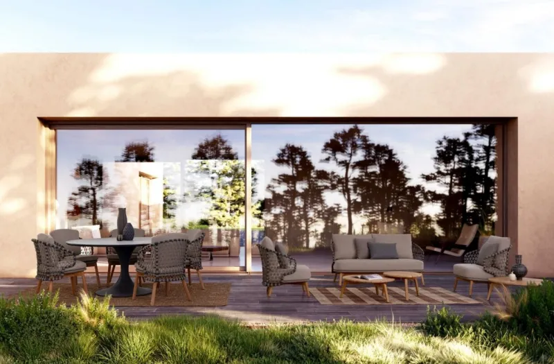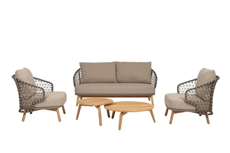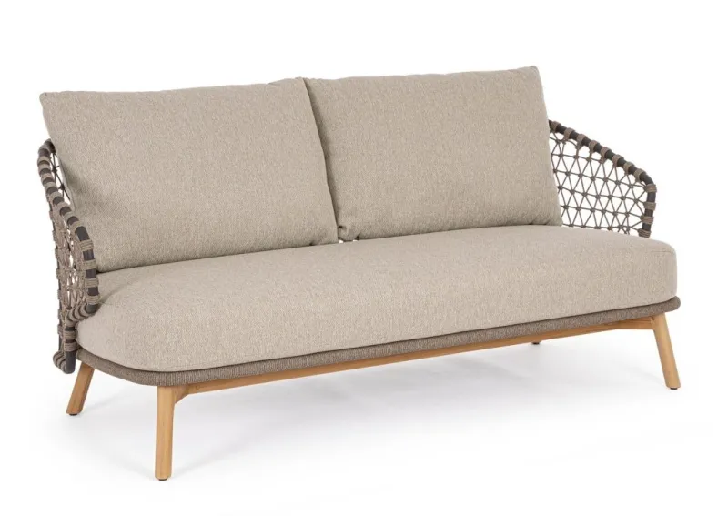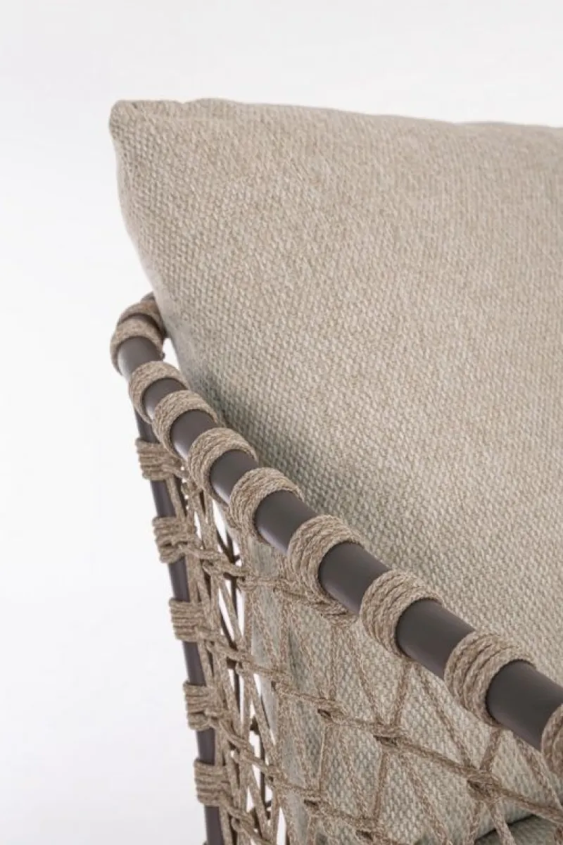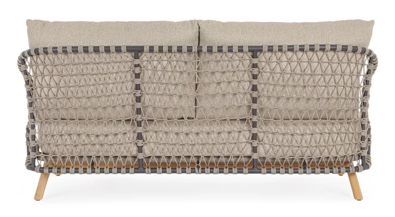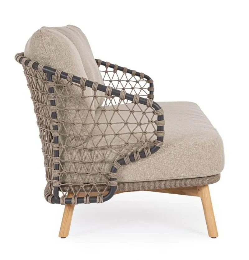 STRUTTURA IN ALLUMINIO VERNICIATA A POLVERE (POLIESTERE). GAMBE IN TEAK – SVLK (LEGNO CERTIFICATO PROVENIENTE DA FORESTE SOSTENIBILI). INTRECCIO PER ESTERNO IN CORDA (POLIPROPILENE). CUSCINI SFODERABILI IN TESSUTO IDROREPELLENTE SUNPROOF OLEFIN (100%POLYPROPYLENE). VITERIA IN ACCIAIO INOSSIDABILE. GAMBE DA ASSEMBLARE.