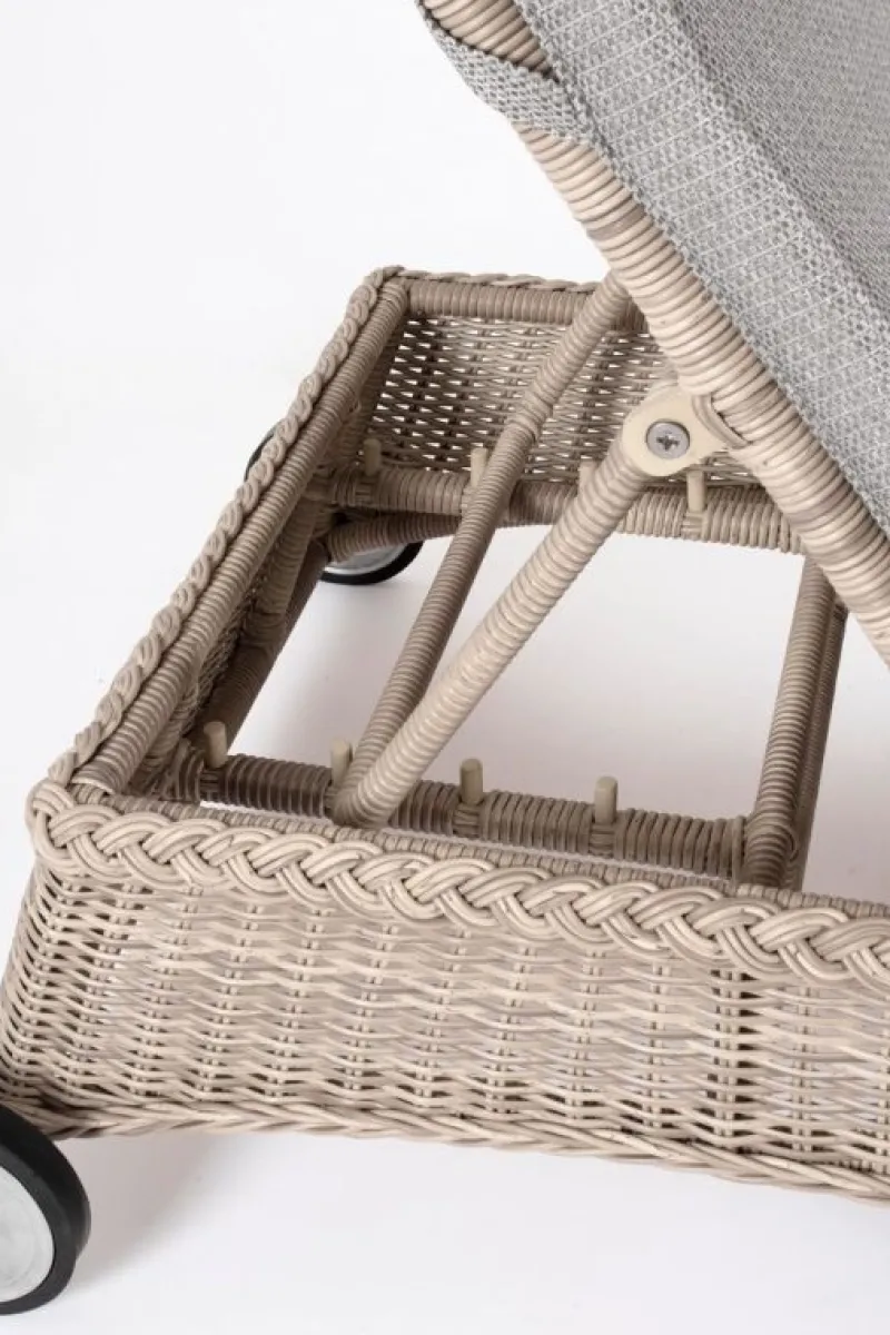 STRUTTURA IN ALLUMINIO VERNICIATO A POLVERE (POLIESTERE), INTRECCIO IN FIBRA SINTETICA (TONDO 5, 3MM).CUSCINI SFODERABILI CON TESSUTO IDROREPELLENTE SUNPROOF OLEFIN (100%POLYPROPYLENE). RUOTE IN ALLUMINIO RIVESTITE DI GOMMA.