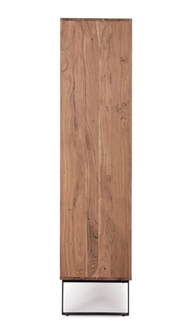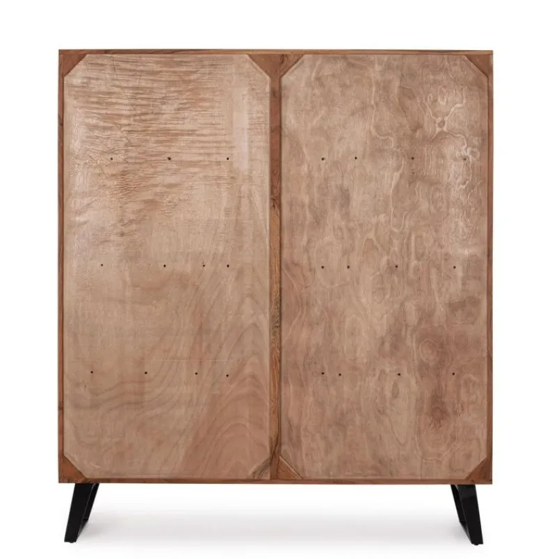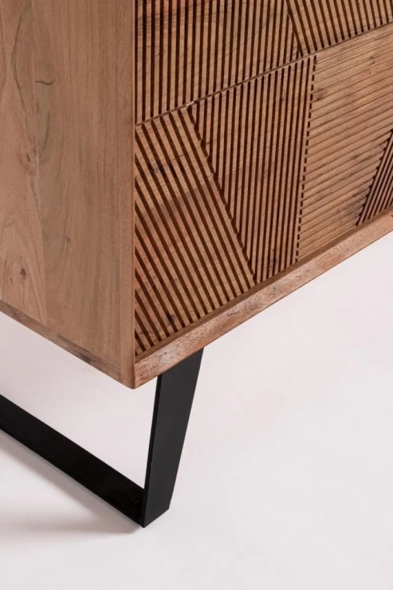 STRUTTURA IN LEGNO DI ACACIA, SCHIENALI IN COMPENSATO. FRONTALI ANTE INTARSIATI E LAVORATI A MANO. FINITURA ACRILICA PROTETTIVA. MANIGLIE E GAMBE IN ACCIAIO. GAMBE DA ASSEMBLARE.