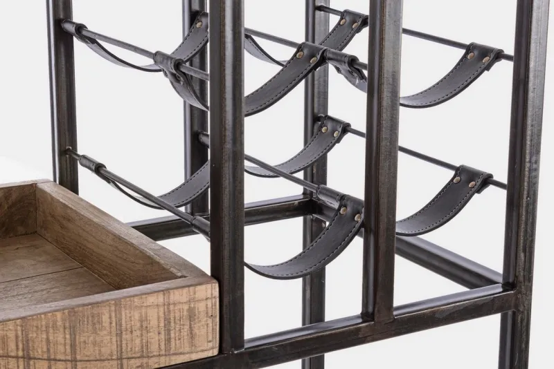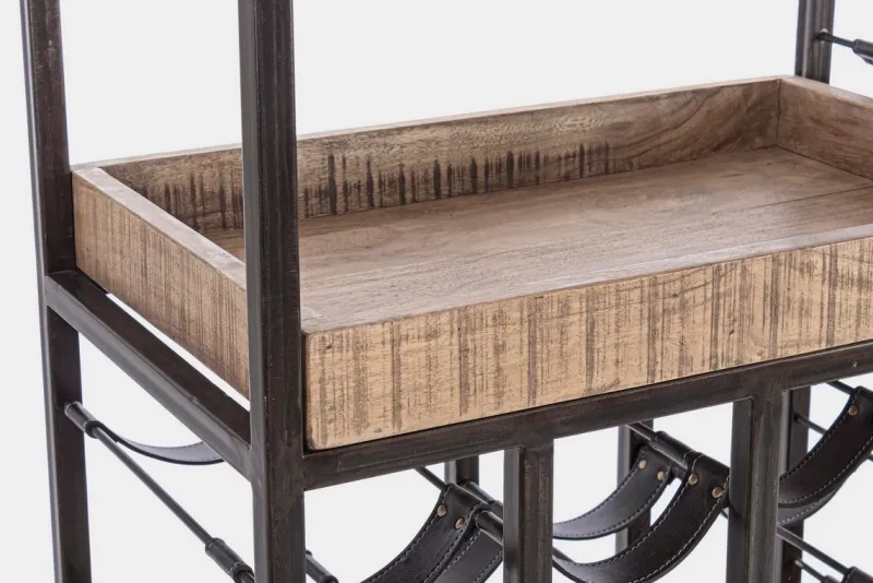 STRUTTURA IN ACCIAIO VERNICIATO A POLVERE EPOSSIDICA. PIANI IN LEGNO D’ACACIA. FINITURA ACRILICA PROTETTIVA. PORTA BOTTIGLIE IN SIMILPELLE (PU).