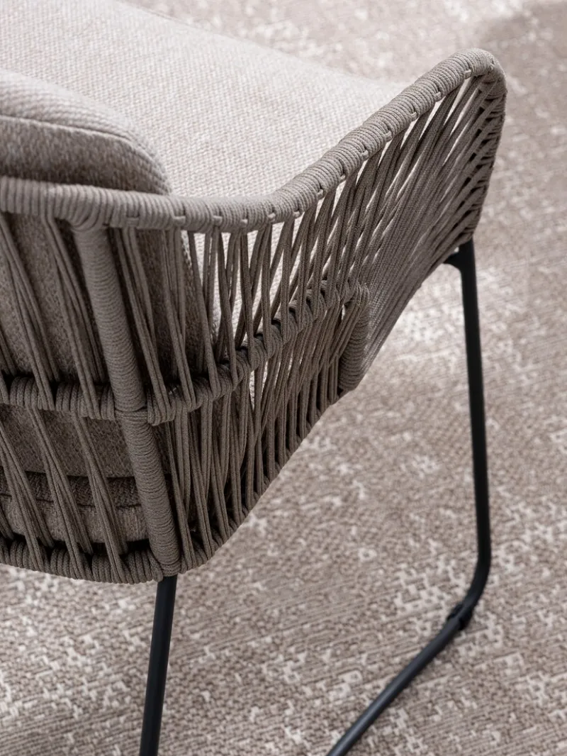 STRUTTURA IN ACCIAIO INOSSIDABILE (201). INTRECCIO PER ESTERNO IN CORDA (POLIPROPILENE). CUSCINI SFODERABILI IN TESSUTO IDROREPELLENTE SUNPROOF OLEFIN (100%POLYPROPYLENE).