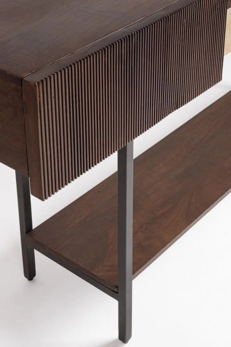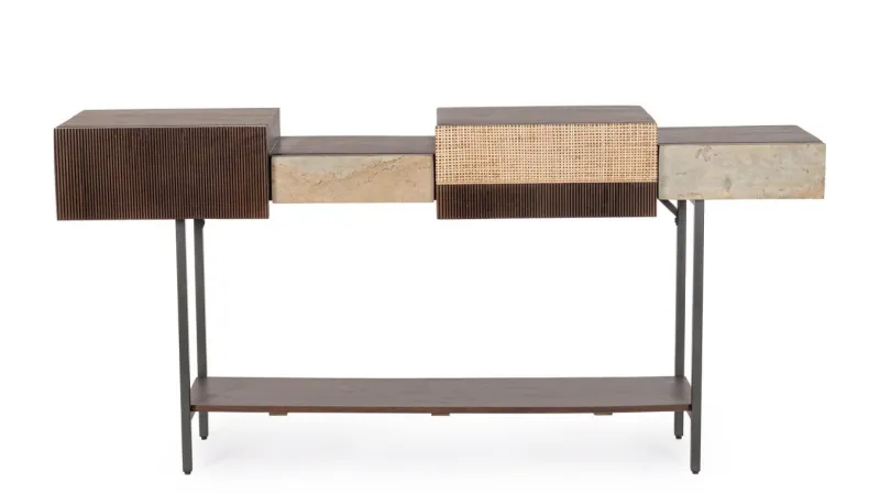STRUTTURA IN LEGNO DI MANGO, SCHIENALE E STRUTTURA CASSETTI IN MDF, FRONTALE CASSETTI: DUE IMPIALLACCIATO PIETRA NATURALE, UNO LEGNO, UNO CON APPLICAZIONI IN RATTAN. FINITURA CON VERNICE A BASE D’ACQUA. GAMBE IN ACCIAIO VERNICIATO A POLVERE EPOSSIDICA. GAMBE DA ASSEMBLARE.