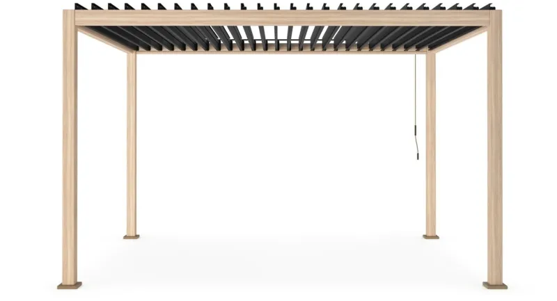 STRUTTURA IN ALLUMINIO. PALI PORTANTI 111X111MM, TRAVERSI 140X75MM. TETTO LAMELLARE VERNICIATO A POLVERE (POLIESTERE),ORIENTABILE TRAMITE MANOVELLA. LAME FRANGISOLE A DOPPIO STRATO 173X30MM. PALI PORTANTI E TRAVERSI CON APPLICAZIONE DI FILM IN PVC (FOGLIO LAMINATO AD ALTA TECNOLOGIA) STAMPATO IN 3D EFFETTO LEGNO VENATO.