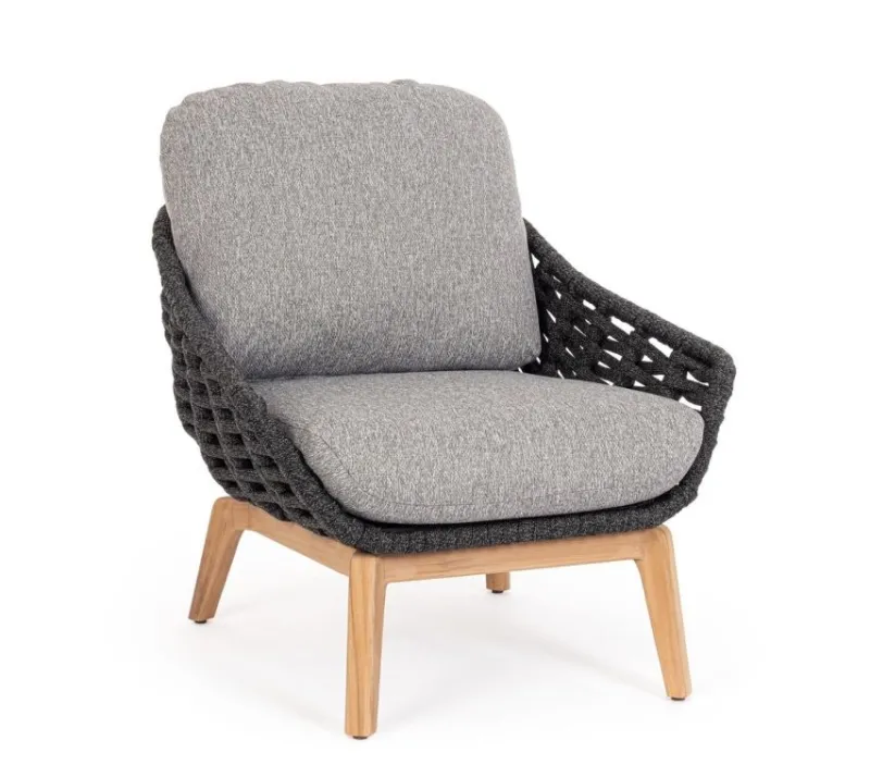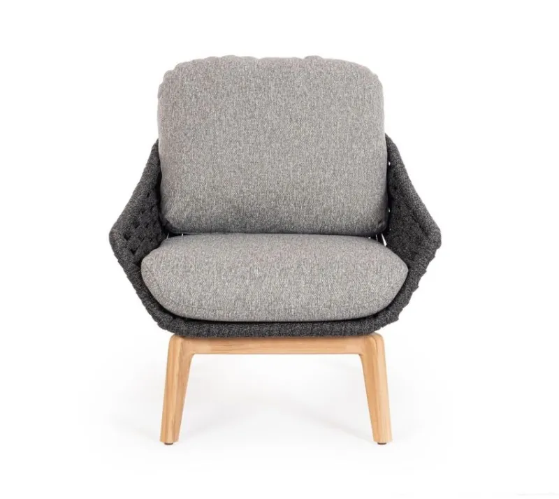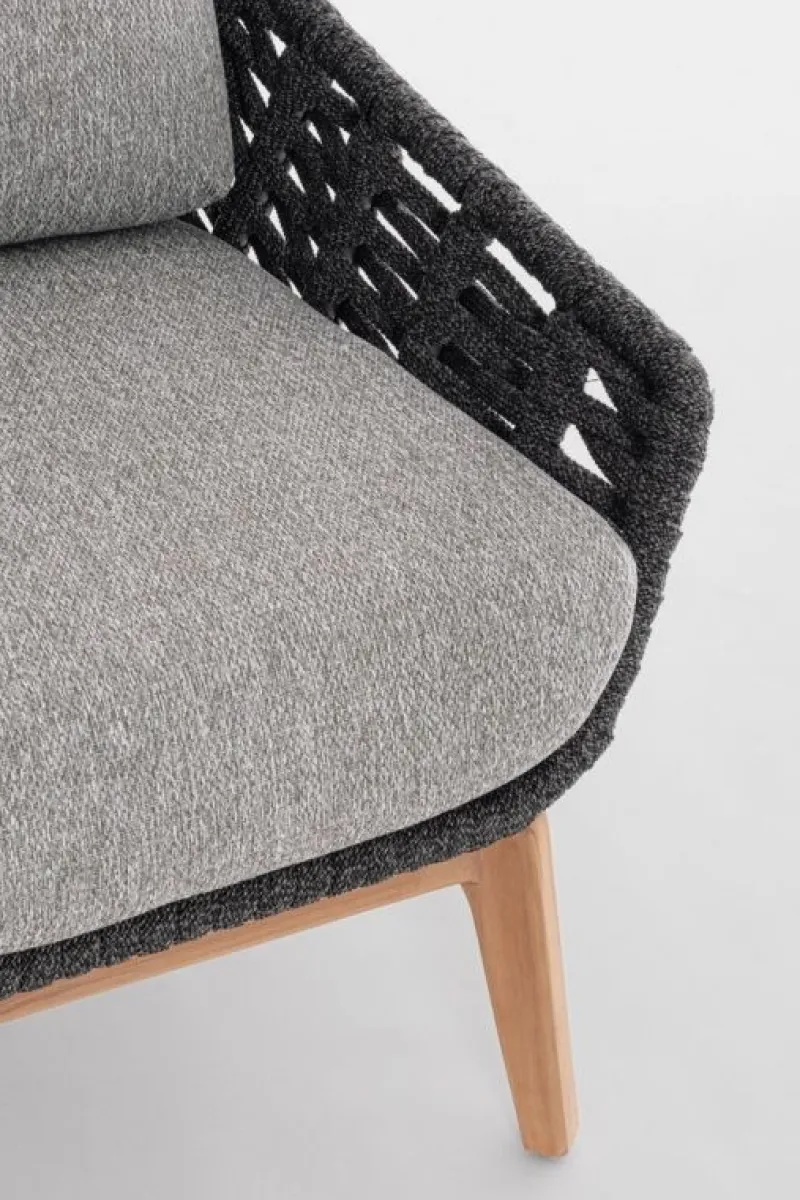 STRUTTURA IN ALLUMINIO VERNICIATA A POLVERE (POLIESTERE). GAMBE IN TEAK – SVLK (LEGNO CERTIFICATO PROVENIENTE DA FORESTE SOSTENIBILI). INTRECCIO PER ESTERNO IN CORDA (POLIPROPILENE). CUSCINI SFODERABILI IN TESSUTO IDROREPELLENTE SUNPROOF OLEFIN (100%POLYPROPYLENE). VITERIA IN ACCIAIO INOSSIDABILE. GAMBE DA ASSEMBLARE.