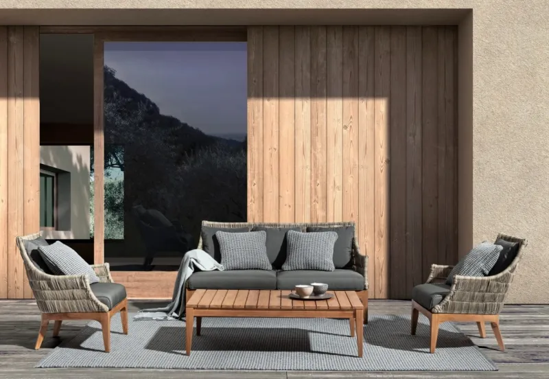 STRUTTURA SCHIENALE IN ALLUMINIO VERNICIATO A POLVERE (POLIESTERE). SEDUTA E GAMBE IN TEAK – SVLK (LEGNO CERTIFICATO PROVENIENTE DA FORESTE SOSTENIBILI). INTRECCIO PER ESTERNO IN FIBRA SINTETICA TONDA 5MM. CUSCINI SFODERABILI CON TESSUTO SUNPROOF OLEFIN (100% POLIPROPILENE). IMBOTTITURA PER ESTERNO QUICK DRY FOAM (ANTIUMIDITA’).