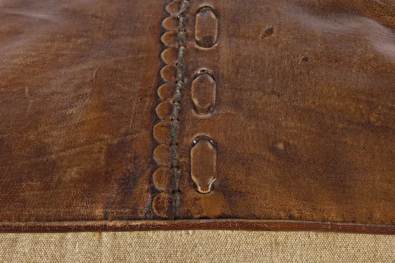 IMBOTTITURA IN COTONE, RIVESTIMENTO IN TELA RICICLATA E VERA PELLE.