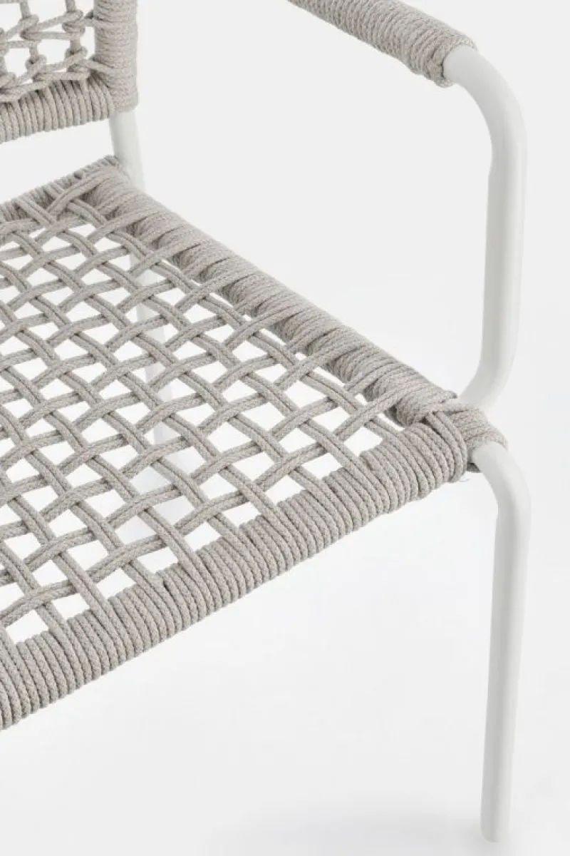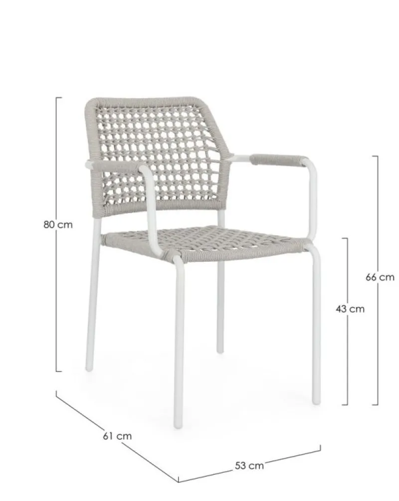 STRUTTURA IN ALLUMINIO VERNICIATA A POLVERE (POLIESTERE). INTRECCIO PER ESTERNO IN CORDA POLIESTERE. IMPILABILE.