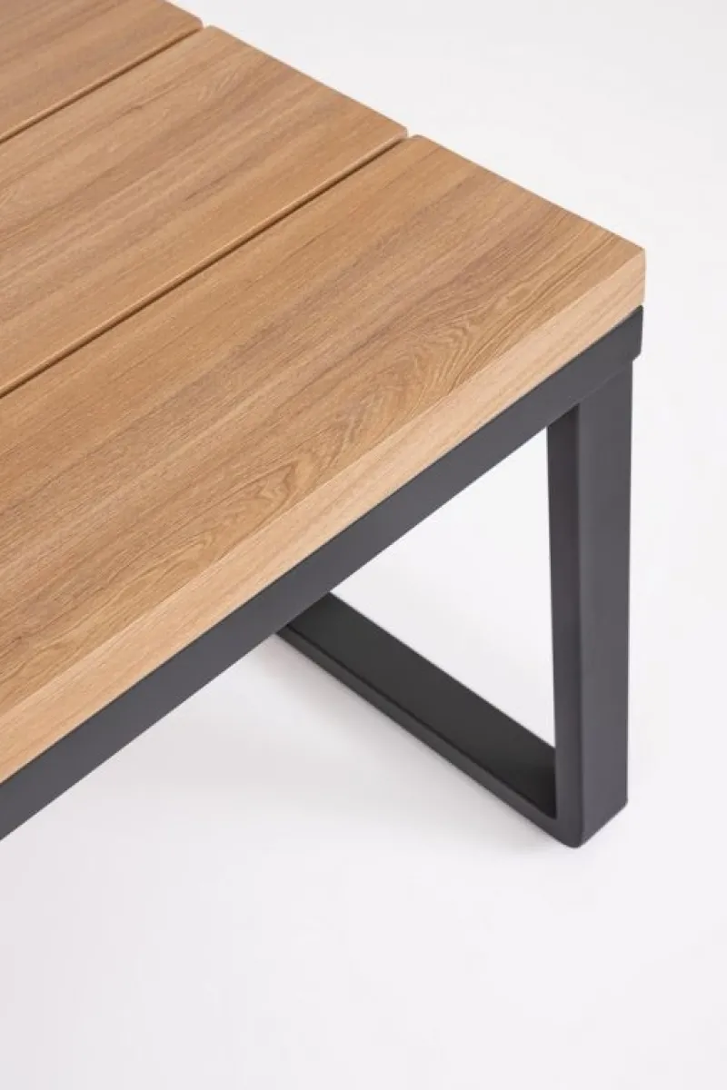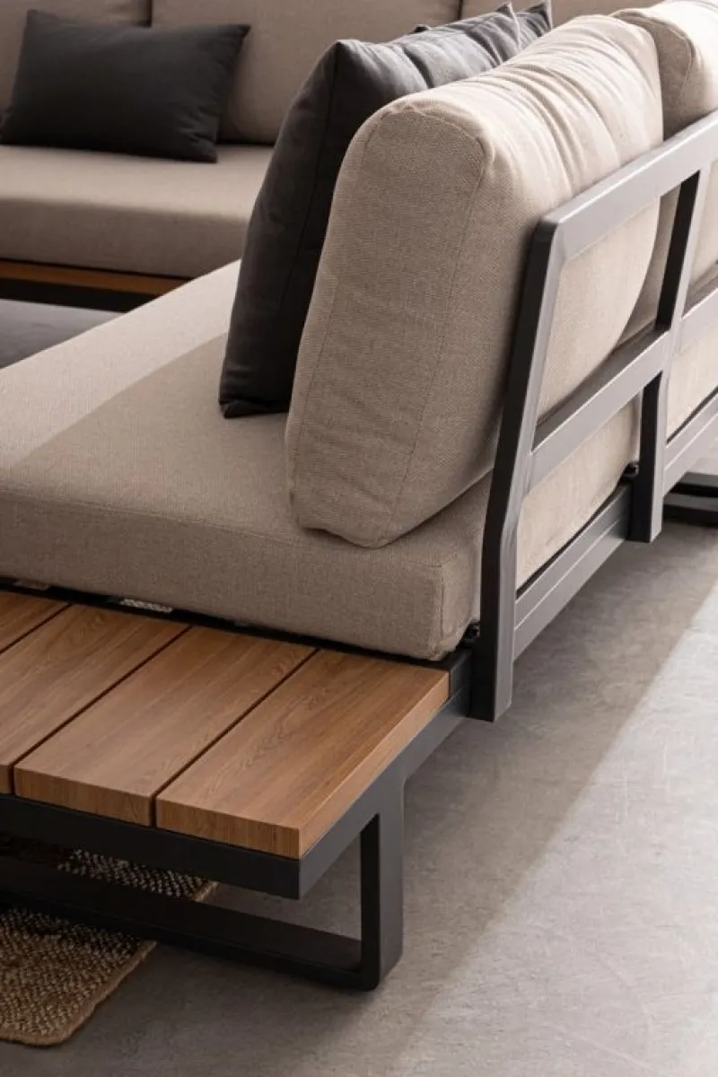 STRUTTURA IN ALLUMINIO VERNICIATO A POLVERE (POLIESTERE). LATERALI DIVANO E PIANO TAVOLINO IN ALLUMINIO CON VERNICIATURA EFFETTO LEGNO. CUSCINI SEDUTA E SCHIENALE SFODERABILI CON TESSUTO IDROREPELLENTE OLEFIN (100% POLIPROPILENE). VITERIA IN ACCIAIO INOSSIDABILE. PIEDINI REGOLABILI. DA ASSEMBLARE.