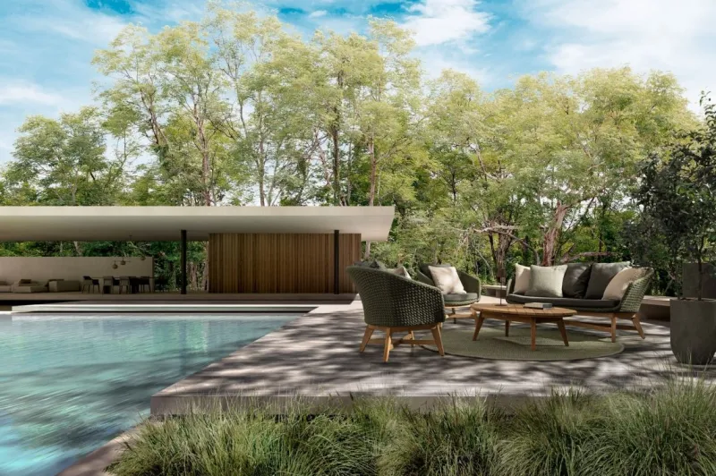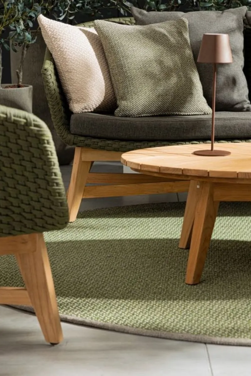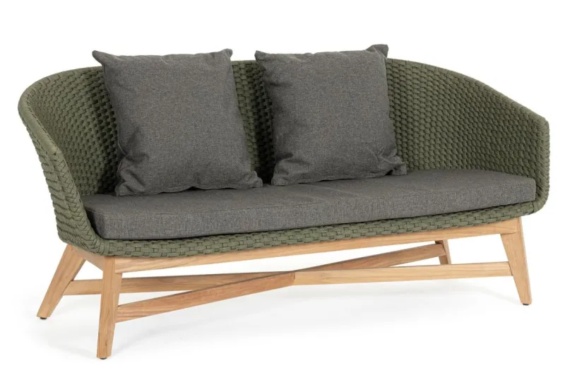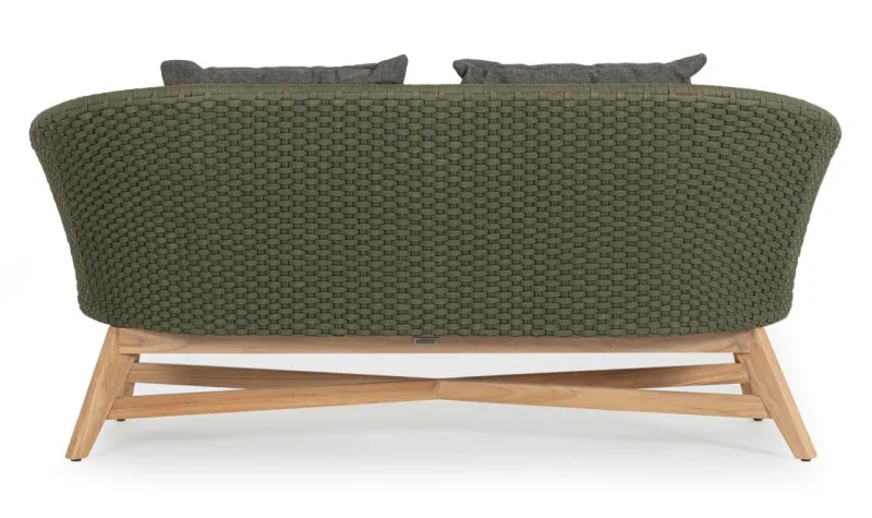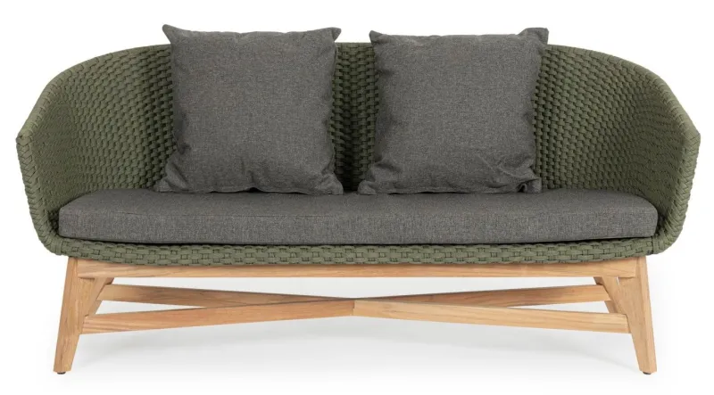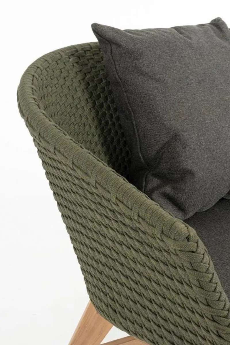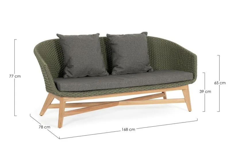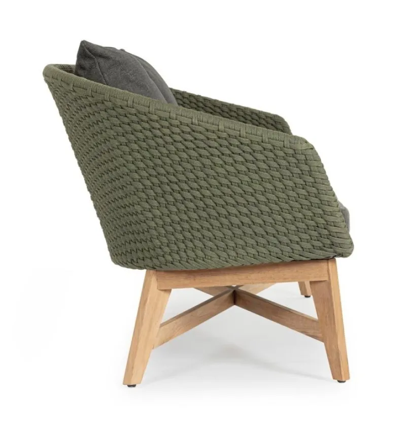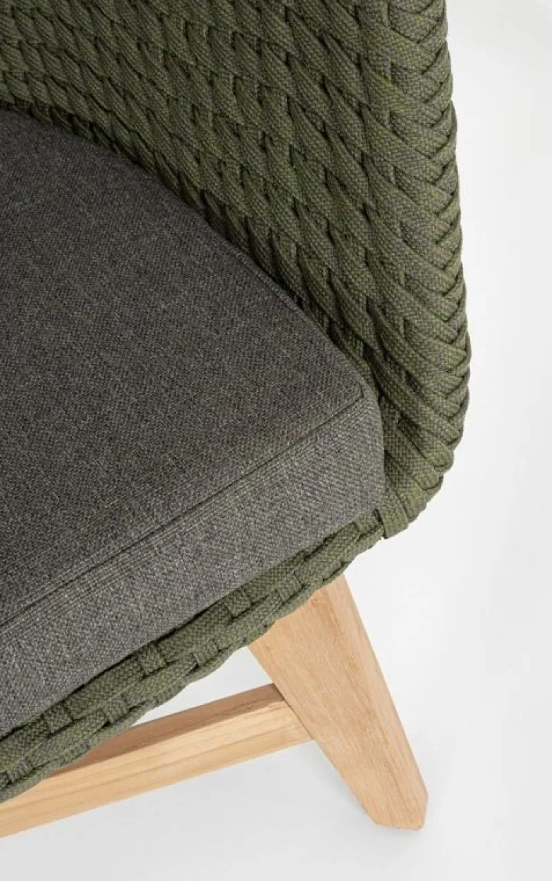 SEDUTA CON STRUTTURA IN ALLUMINIO VERNICIATA A POLVERE (POLIESTERE). INTRECCIO IN CORDA OLEFIN (100% POLIPROPILENE). CUSCINO SEDUTA E SCHIENALE SFODERABILE IN TESSUTO IDROREPELLENTE SUNPROOF OLEFIN (100% POLIPROPILENE). GAMBE IN TEAK – SVLK (LEGNO CERTIFICATO PROVENIENTE DA FORESTE SOSTENIBILI). VITERIA IN ACCIAIO GALVANIZZATO. GAMBE DA ASSEMBLARE. ATTENZIONE: PRIMA DI PROCEDERE AL MONTAGGIO, ASSICURARSI CHE LA NUMERAZIONE SEDUTA-GAMBE COINCIDA.