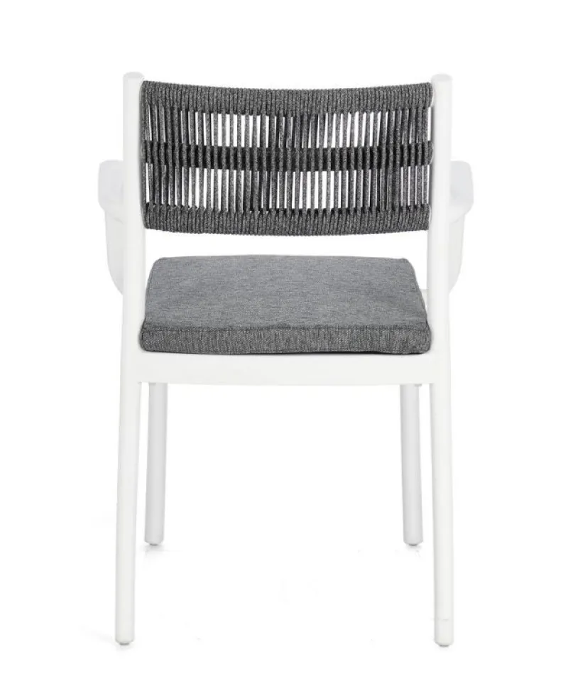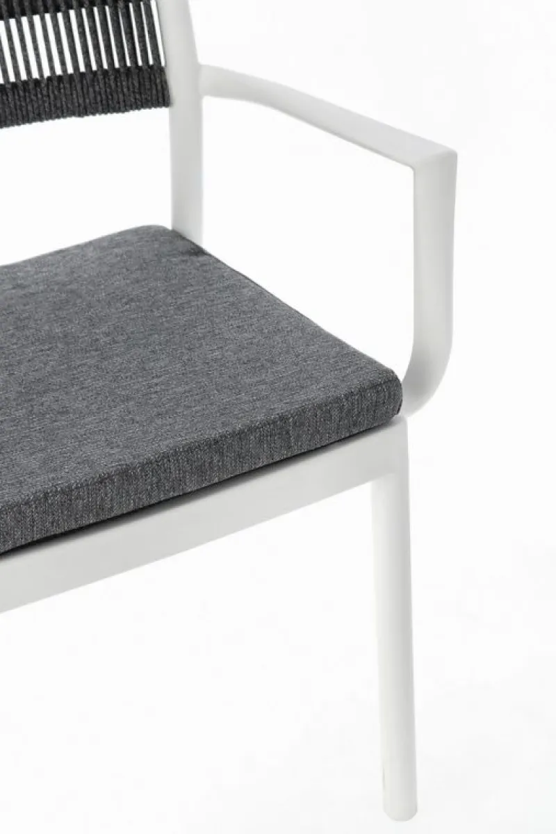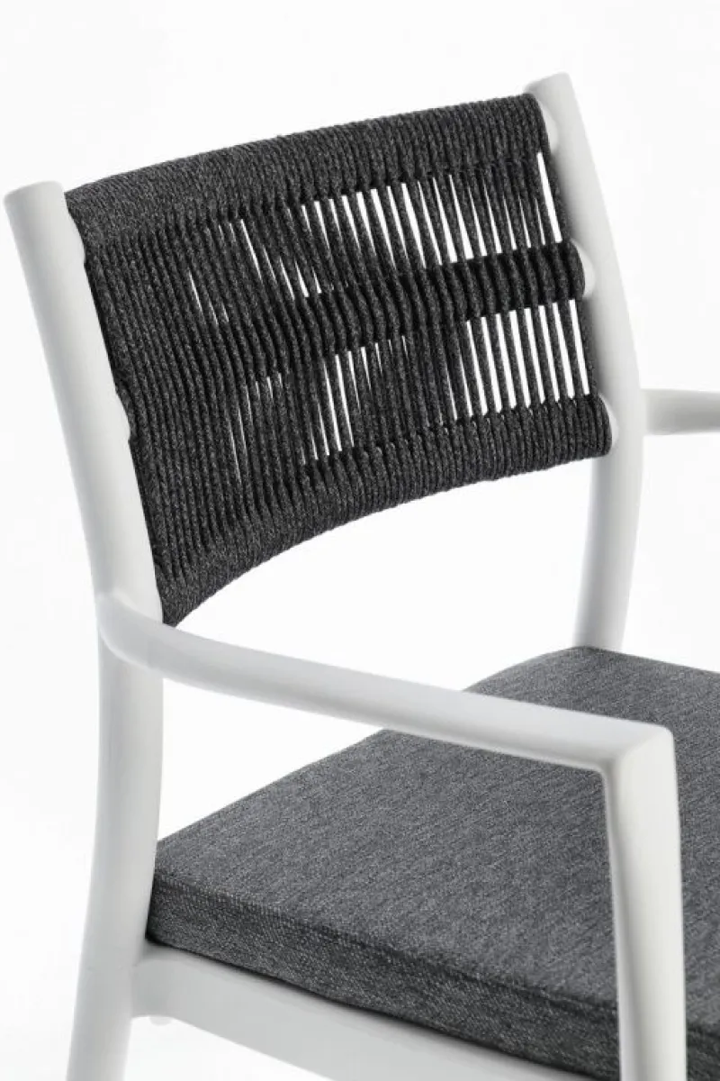 POLIPROPILENE (PP), RESISTENTE AI RAGGI UV. SCHIENALE CON INTRECCIO IN CORDA DI POLIESTERE. CUSCINO SEDUTA SFODERABILE CON TESSUTO IDROREPELLENTE POLIESTERE. IMPILABILE.