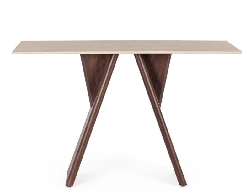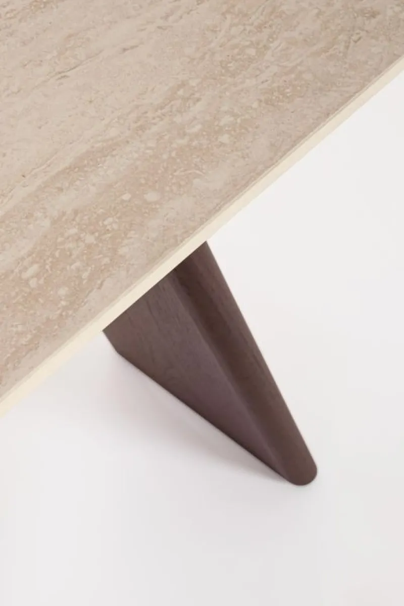PIANO IN GRES PORCELLANATO CON EFFETTO TRAVERTINO. SUPPORTO PIANO IN ACCIAIO VERNICIATO A POLVERE EPOSSIDICA. GAMBE IN COMPENSATO IMPIALLACCIATO LEGNO DI NOCE. GAMBE DA ASSEMBLARE.