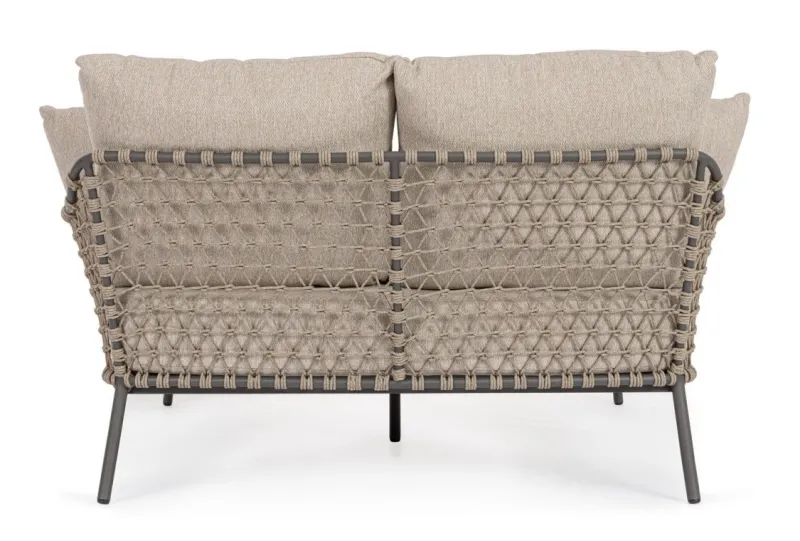 STRUTTURA IN ACCIAIO INOSSIDABILE (201). INTRECCIO PER ESTERNO IN CORDA (POLIPROPILENE). CUSCINI SFODERABILI IN TESSUTO IDROREPELLENTE SUNPROOF OLEFIN (100%POLYPROPYLENE).