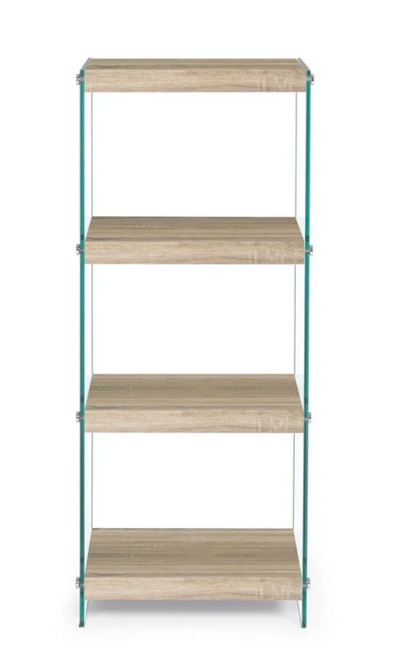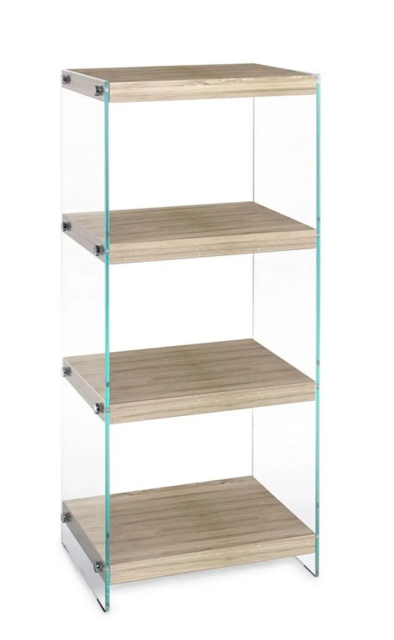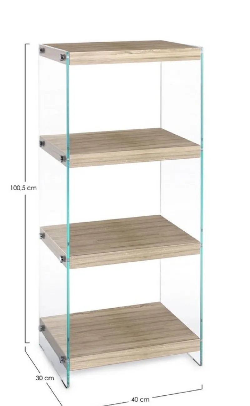 MENSOLE IN MDF RIVESTITE IN CARTA MELAMINICA EFFETTO LEGNO. FIANCHI IN VETRO TEMPERATO SPESSORE 12MM. DA ASSEMBLARE.