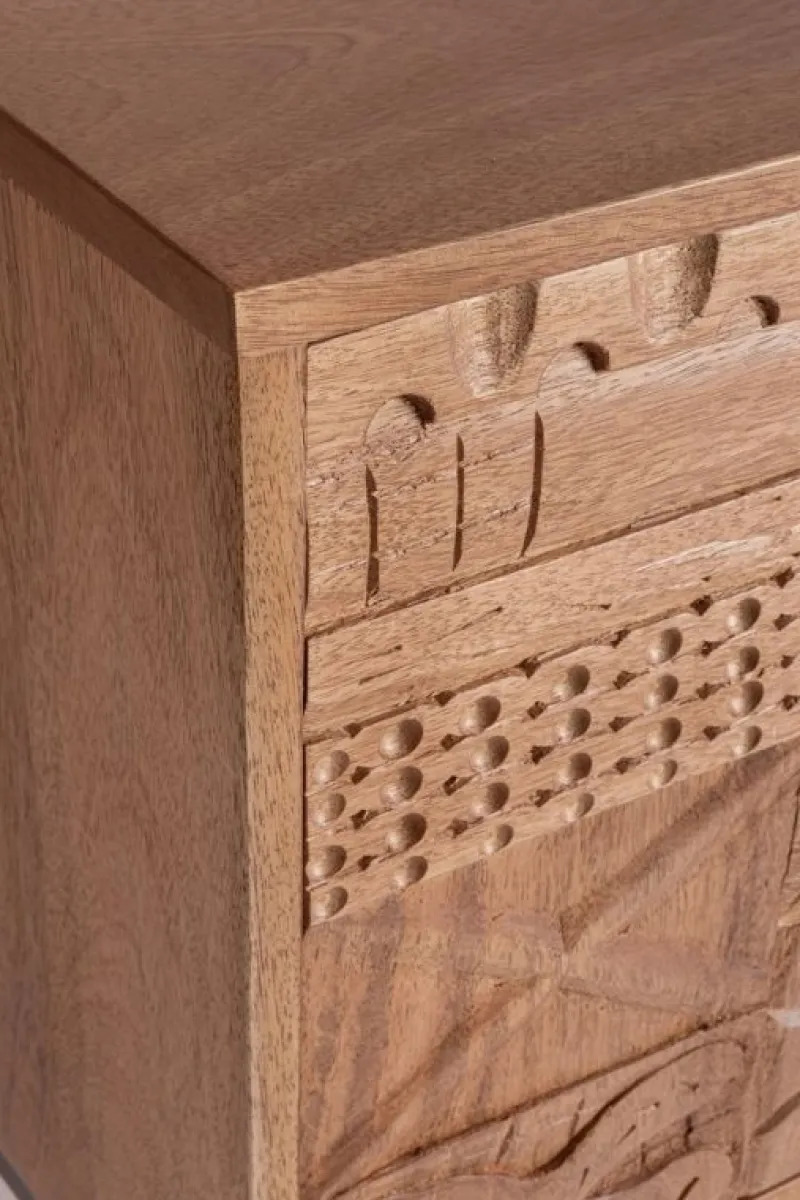 STRUTTURA IN LEGNO MANGO MASSICCIO, SCHIENALE IN MDF. VERNICIATURA A BASE DI NITROCELLULOSA. GAMBE E MANIGLIE IN ACCIAIO. FRONTALE CASSETTI ED ANTE INTARSIATI E LAVORATI A MANO. VANO PORTA COMPRENSIVO DI MENSOLA. GAMBE DA ASSEMBLARE.