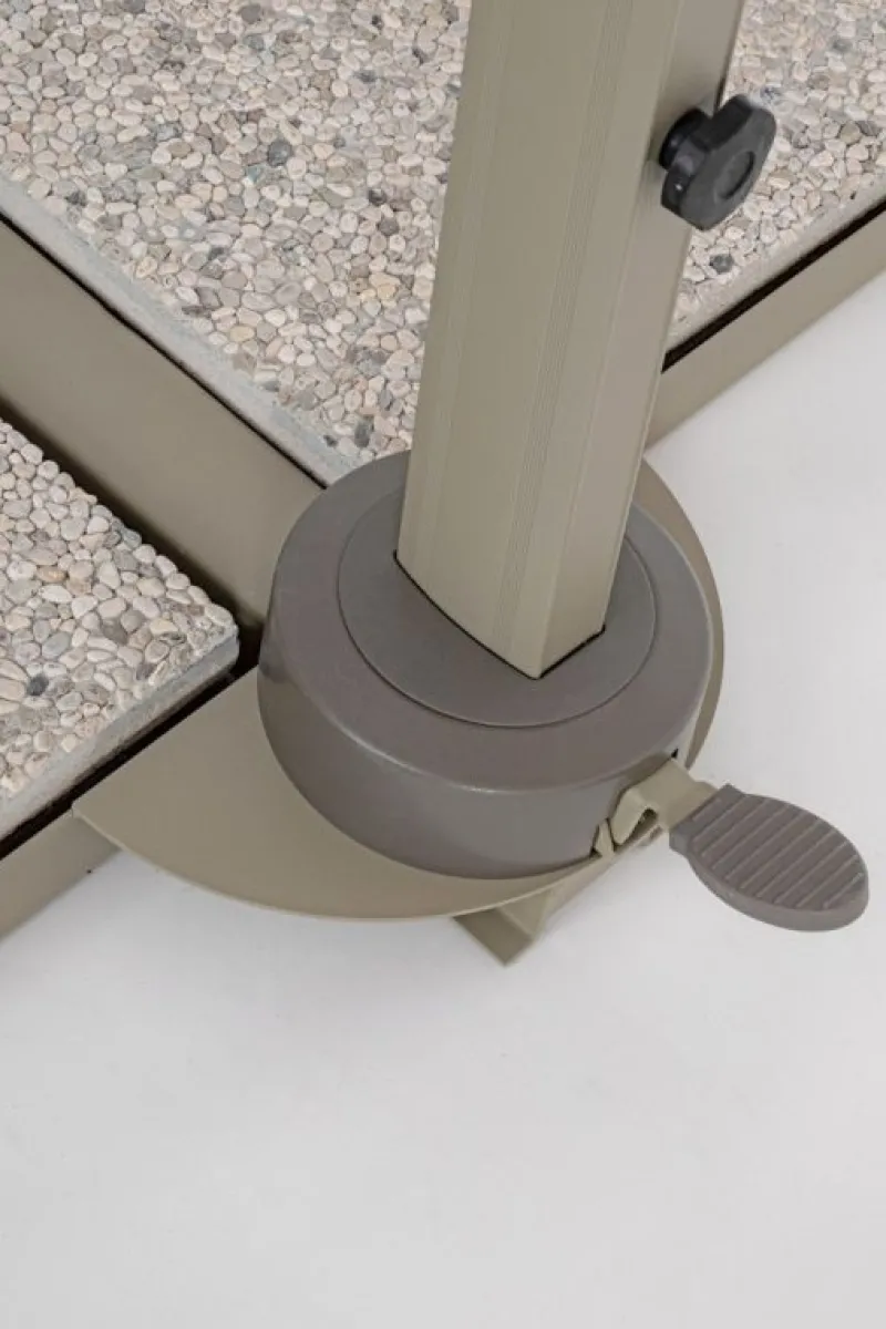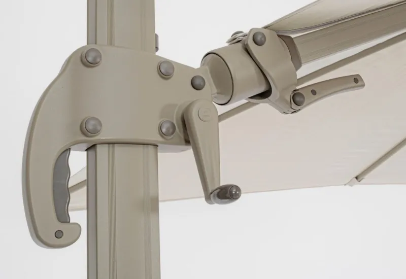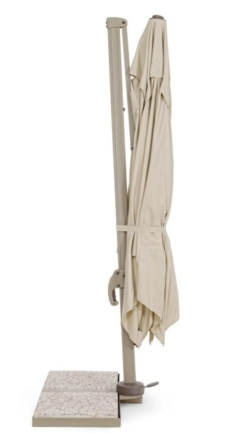STRUTTURA IN ALLUMINIO VERNICIATA A POLVERE (POLIESTERE). PALO 50x78x1.6MM. 8 STECCHE 23x12x1.0MM. TELO COLOR SABBIA IN POLIESTERE 250GR/M2 CON RIVESTIMENTO IN PA (POLIAMMIDE) CON CAMINO ANTIVENTO. BASE LATERALE IN ACCIAIO. PALO GIREVOLE 360° CON PEDALINA. INCLINAZIONE VERTICALE CON IMPUGNATURA A 5 POSIZIONI. DOTATO DI MANIGLIA PER INCLINAZIONE OMBRELLO DESTRA-SINISTRA. MARMETTE NON